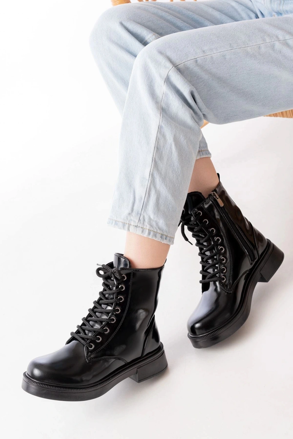 02-356 Siyah Rugan Düz Topuklu Bağcıklı Fermuarlı Günlük Kadın Bot