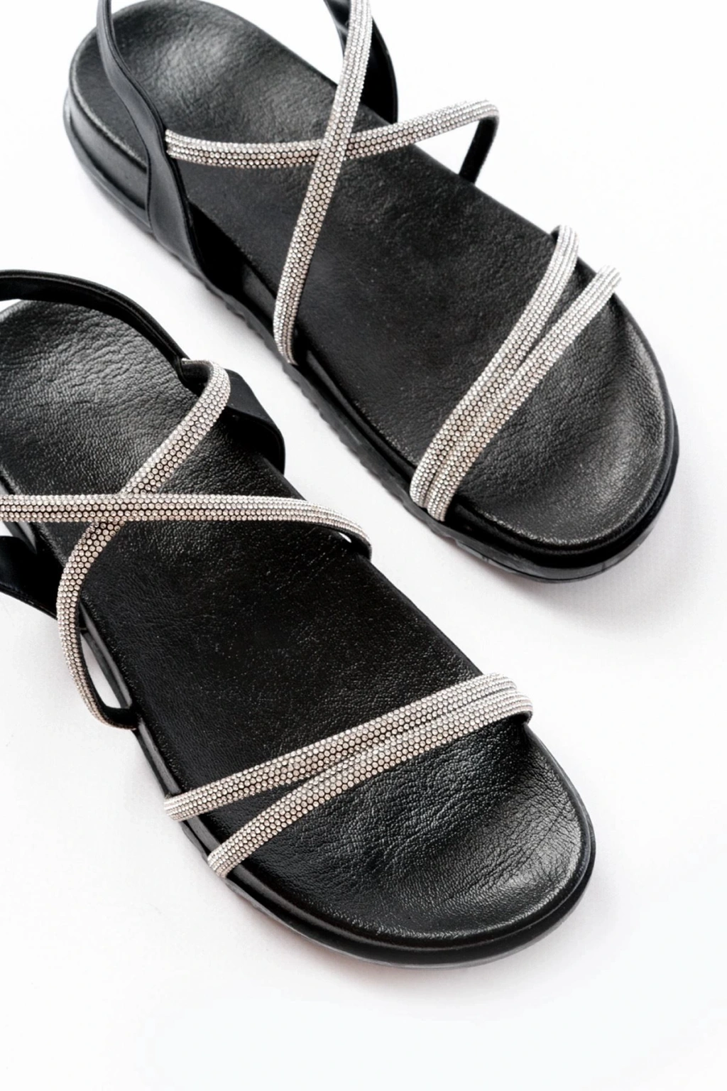 1001-1105 Siyah Gümüş Taşlı Günlük Kadın Sandalet