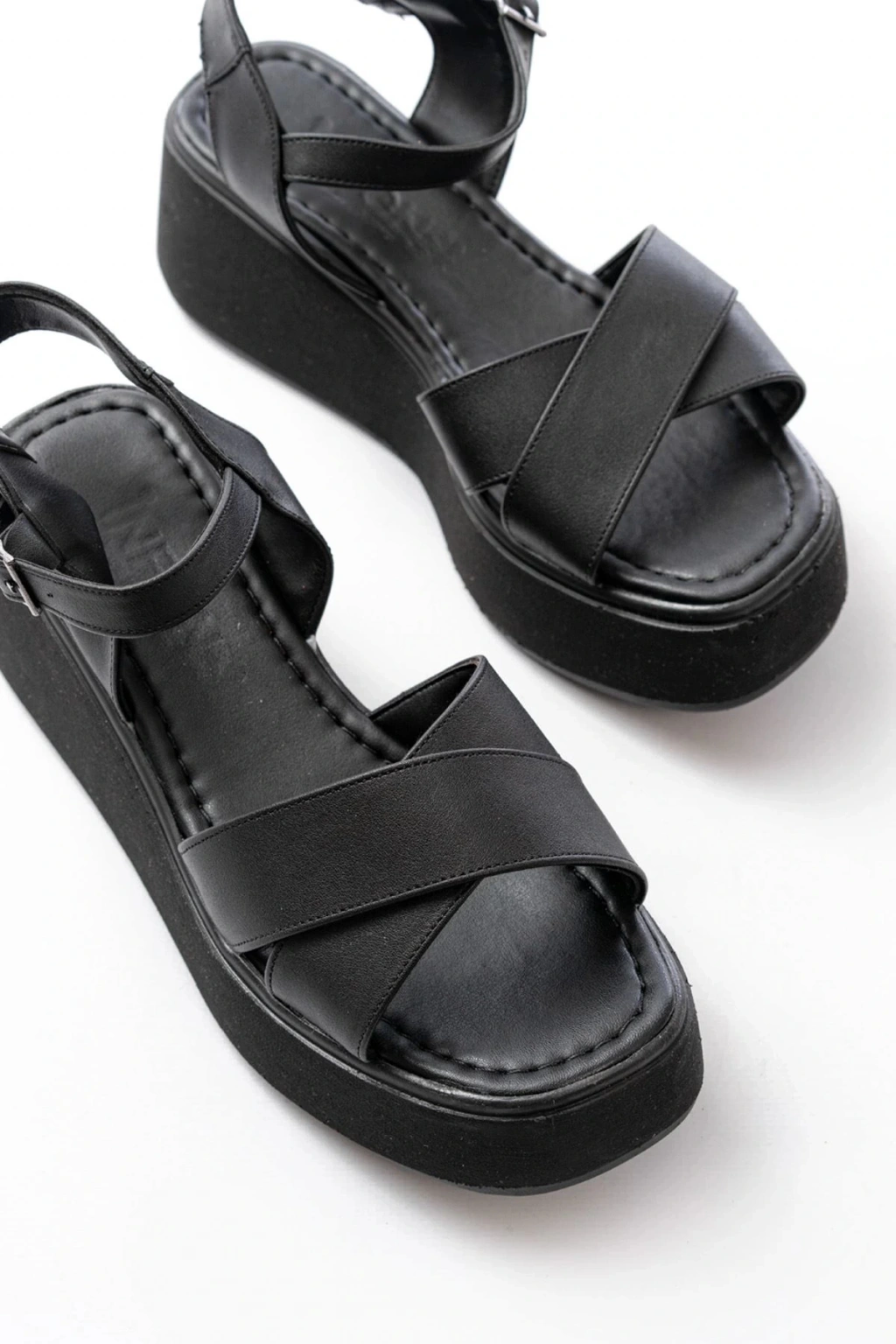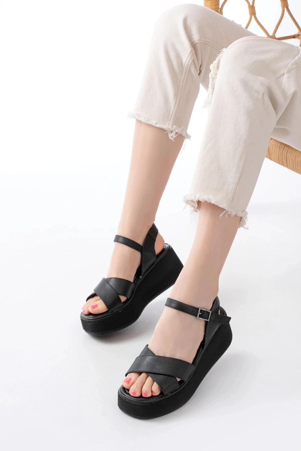 1024 Siyah Dolgu Topuk Çapraz Tokalı Ortopedik Taban Kadın Sandalet