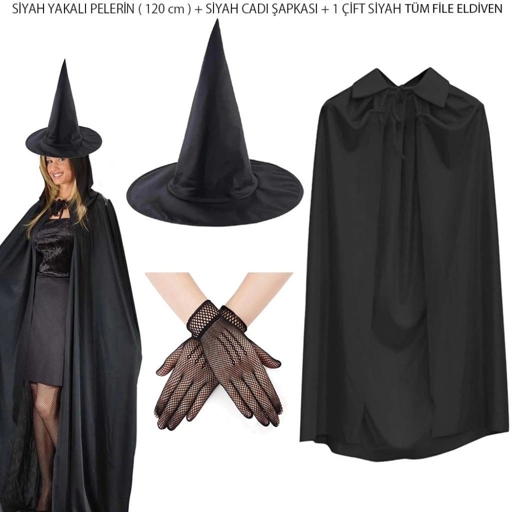 Temalı partiler, tiyatro gösterileri ve cosplay etkinlikleri için özel olarak tasarlanmış bu 3 parçalı cadı kostüm seti, gizemli ve şık bir görünüm sunar. Set içerisinde 120 cm siyah yakalı pelerin, klasik cadı şapkası ve uzun tasarımlı 1 çift siyah file tüm eldiven bulunur. Hafif ve rahat kumaşı sayesinde kolay kullanım sağlar. Yetişkinler için uygundur ve kostümünüzü tamamlayarak dikkat çekici bir tarz oluşturur.