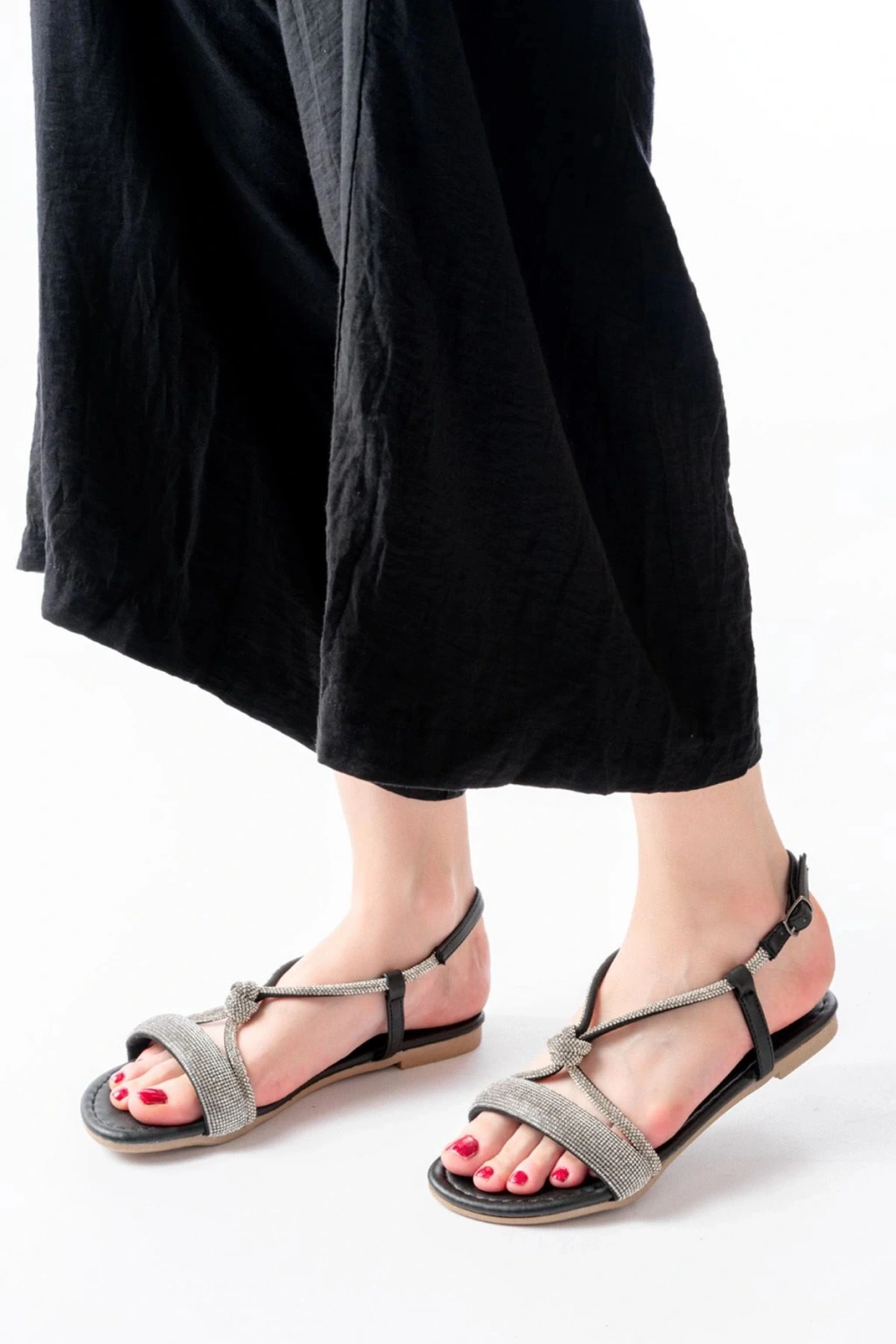 152-1104 Siyah Gümüş Taşlı Günlük Kadın Sandalet