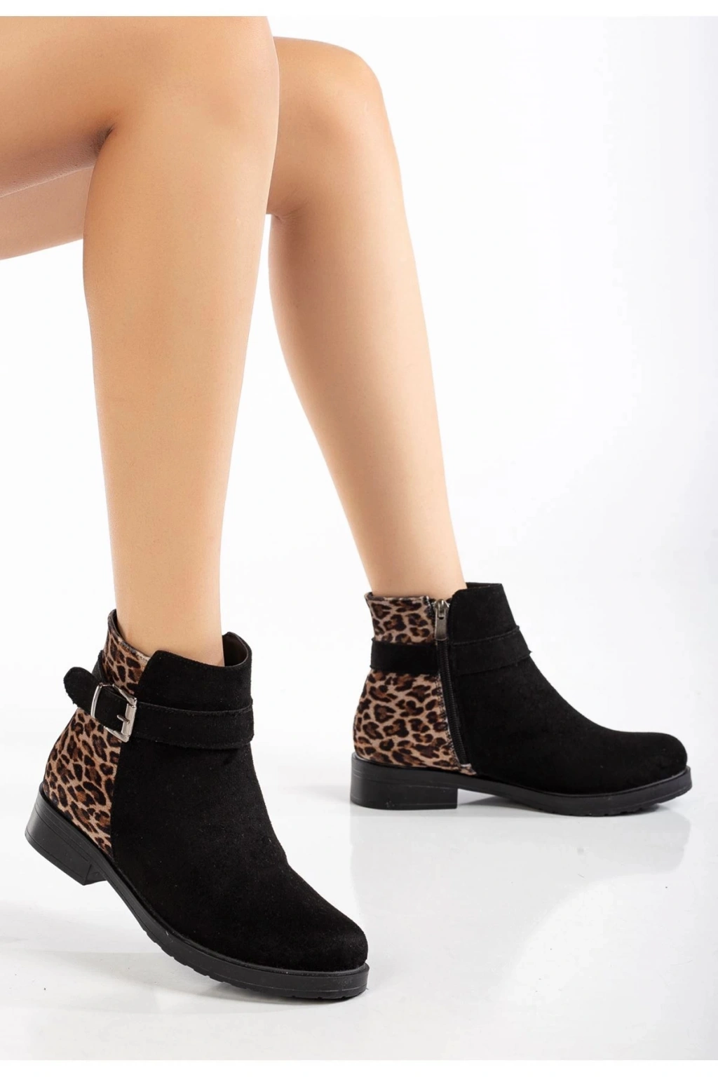 165-204/1 Siyah Süete Leopar Toka Aksesuarlı Fermuarlı Günlük Kadın Bot