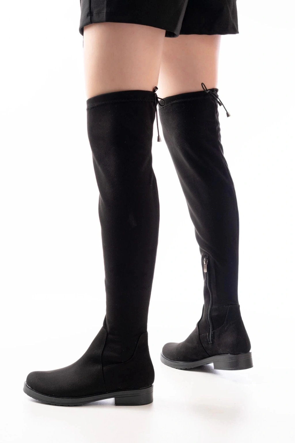 165-Streç Siyah Süet Diz Üstü Fermuarlı Günlük Kadın Çizme