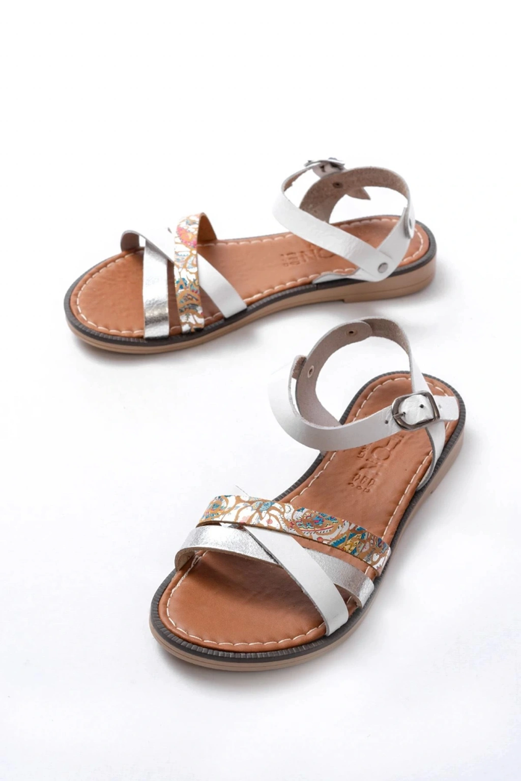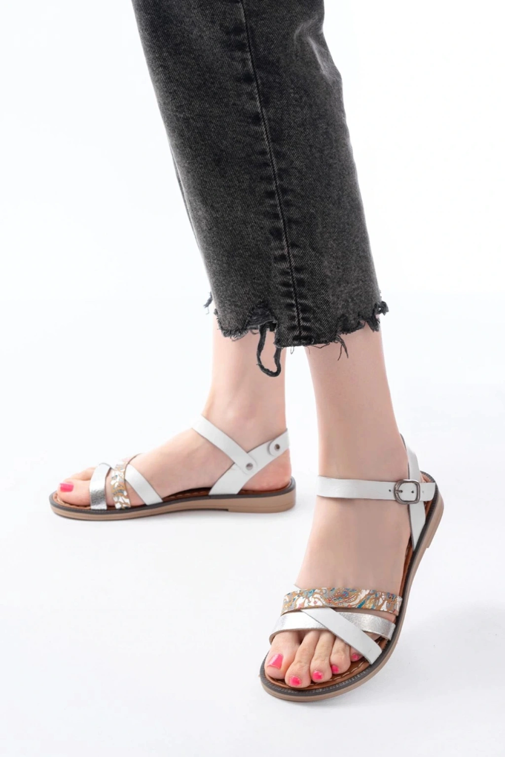 1001-1001 Beyaz Gümüş Bilekten Bağcıklı Kadın Sandalet