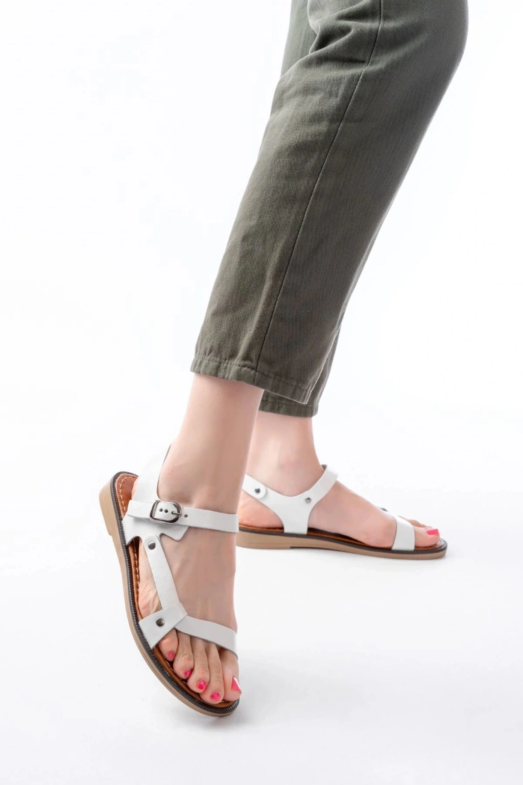 205-090 Beyaz Hakiki Deri Tokalı Kadın Sandalet