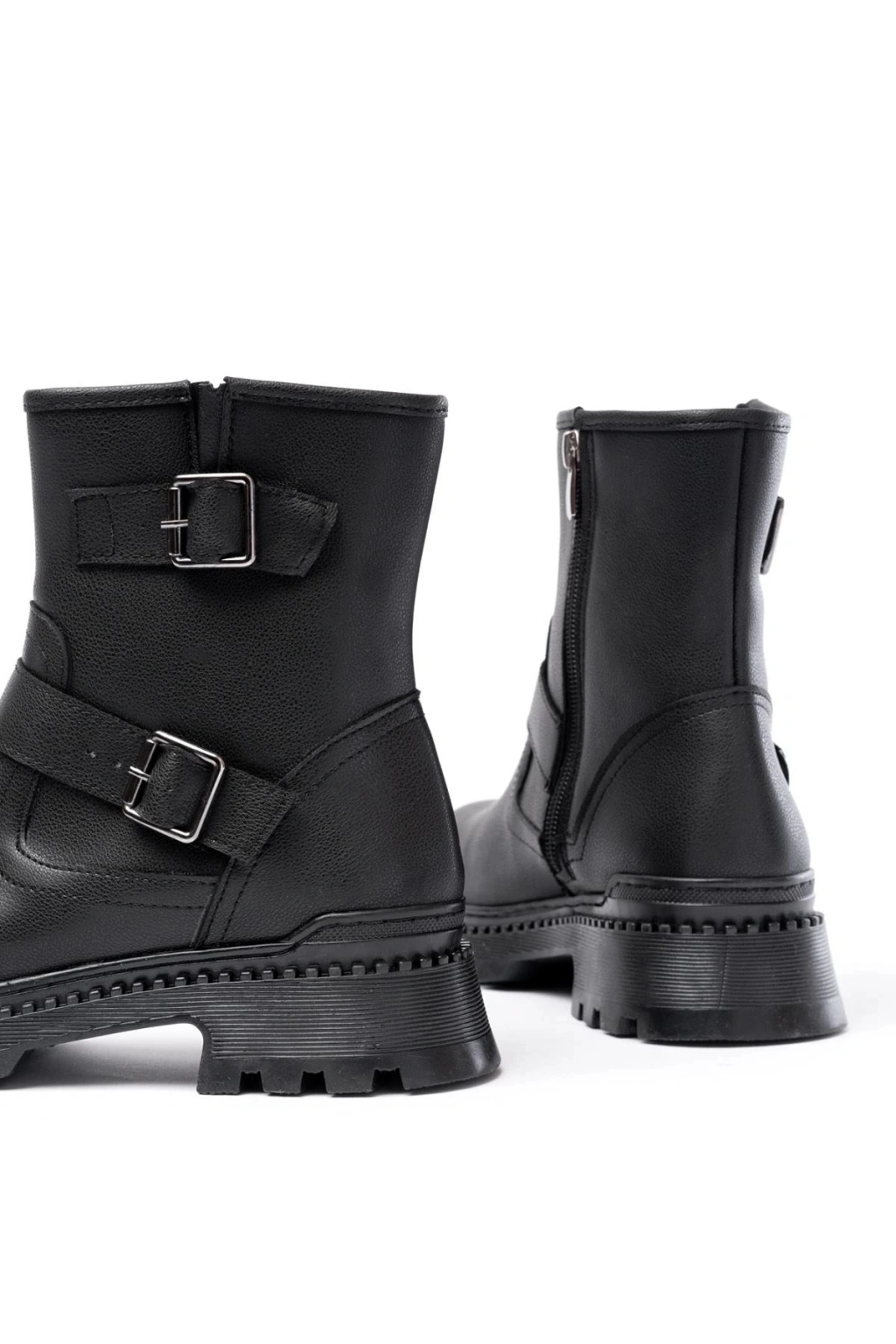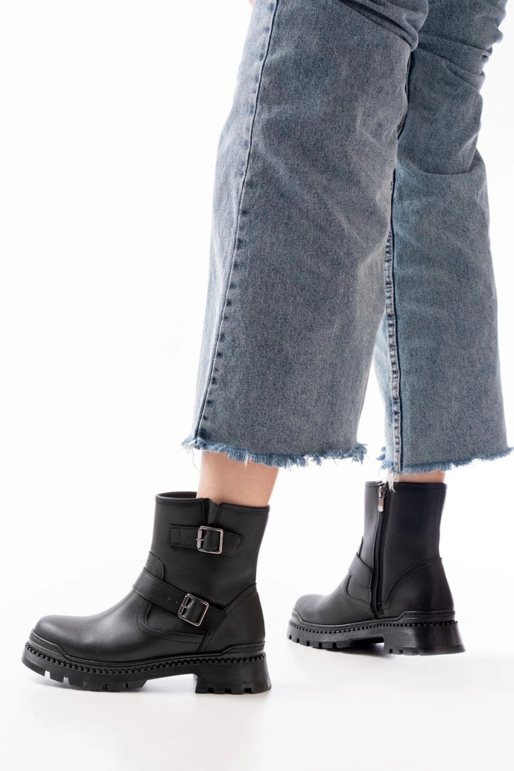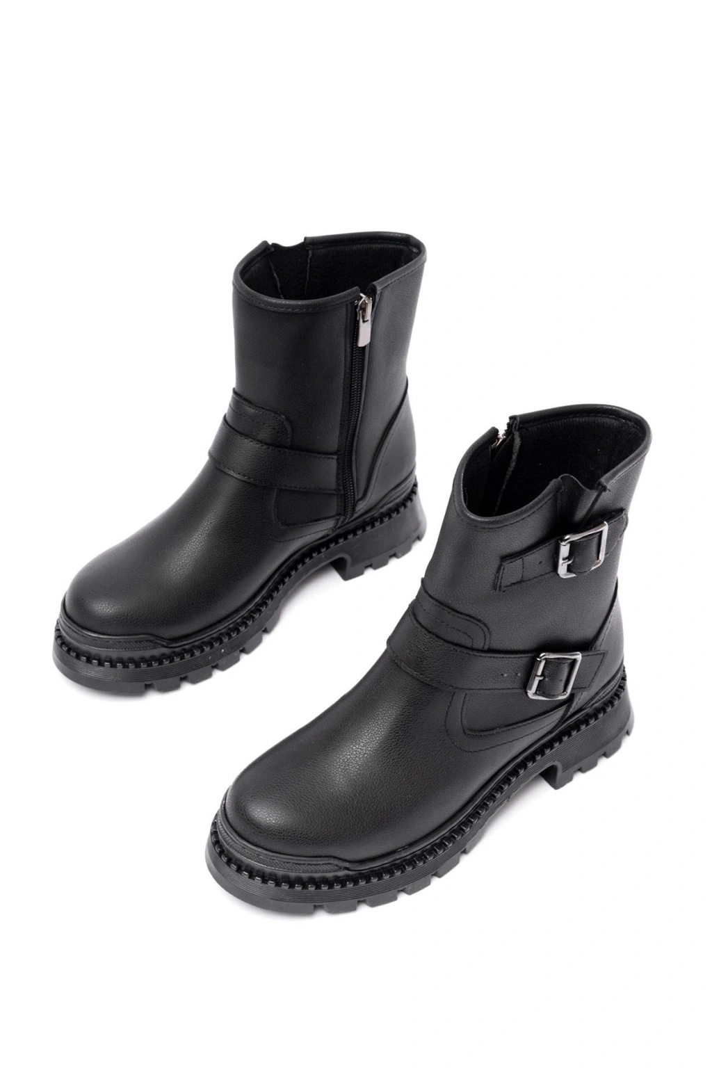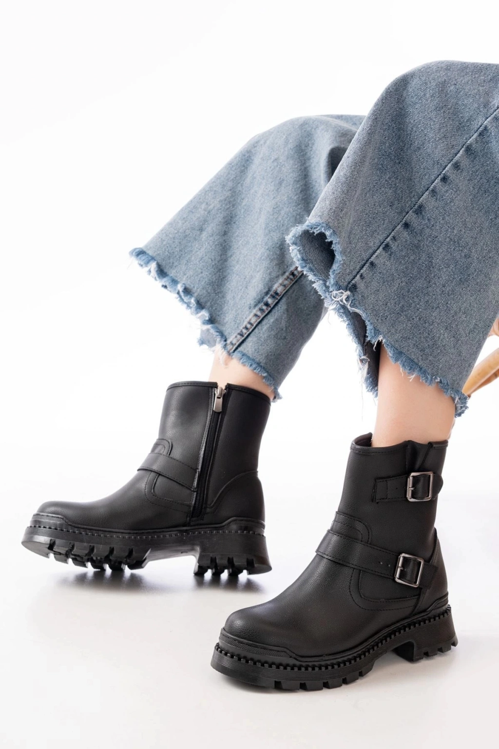 2051-2014 Siyah Tokalı Düz Topuklu Tokalı Fermuarlı Günlük Kadın Bot