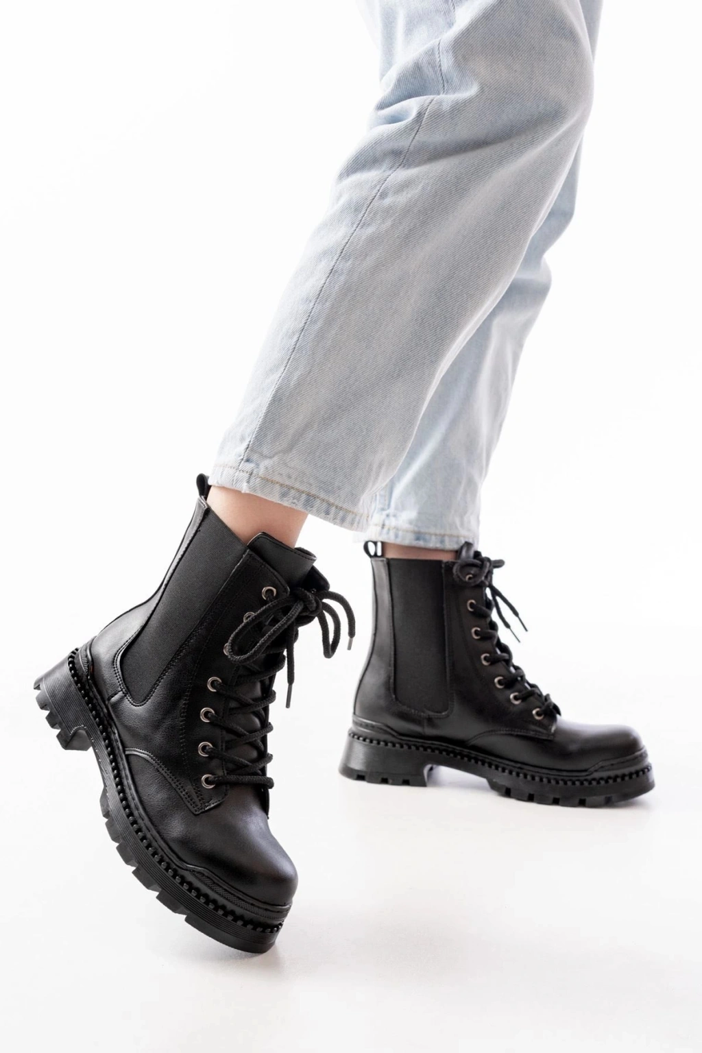 2051-298 Siyah Cilt Düz Topuklu Bağcıklı Lastikli Günlük Kadın Bot