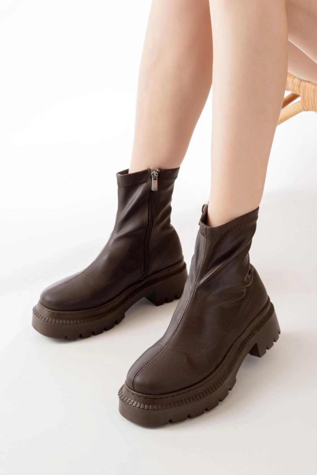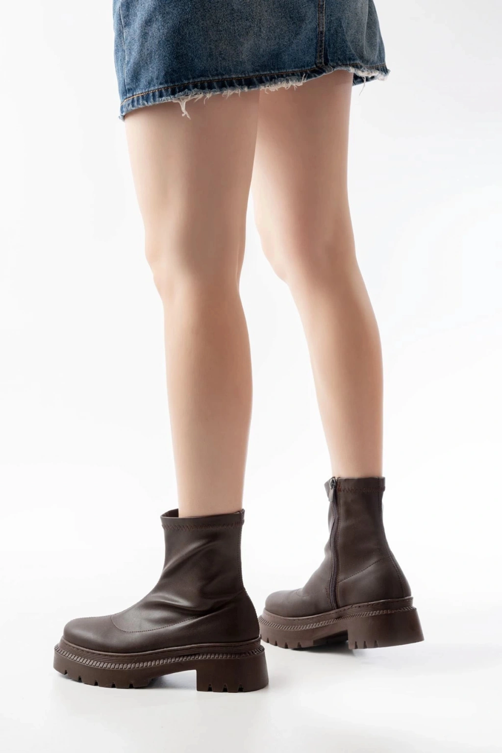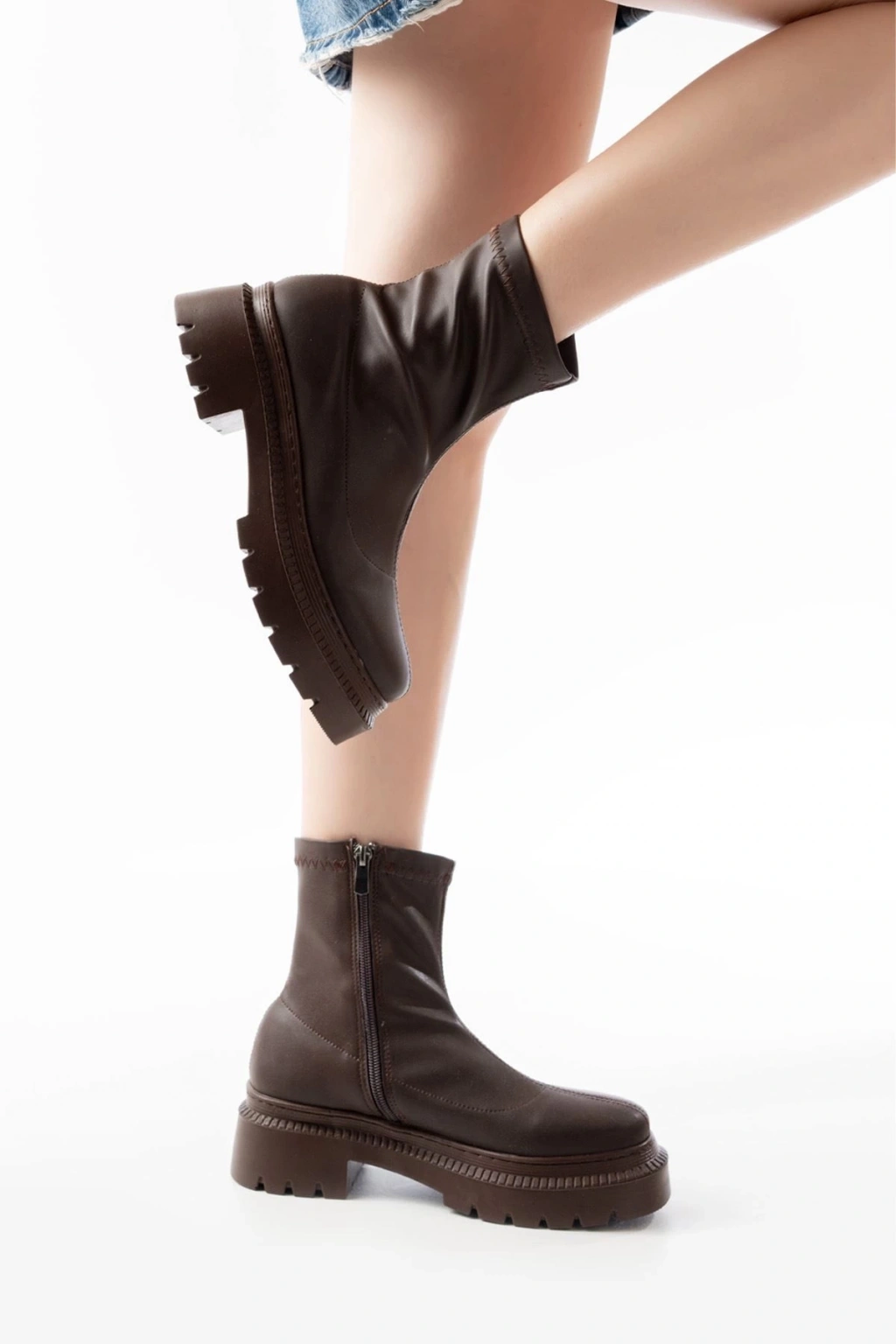 236-2011 Kahve Streç Fermuarlı Günlük Kadın Bot