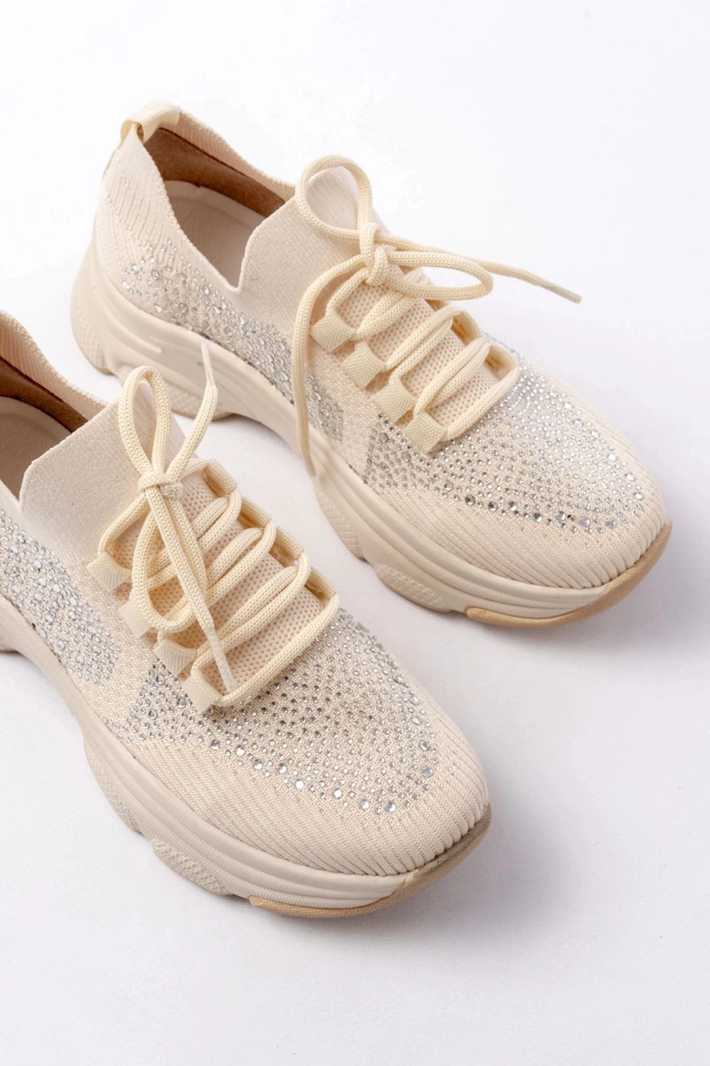 3002 Bej Bağcıklı Fileli Taş Aksesuarlı Günlük Spor Ayakkabı