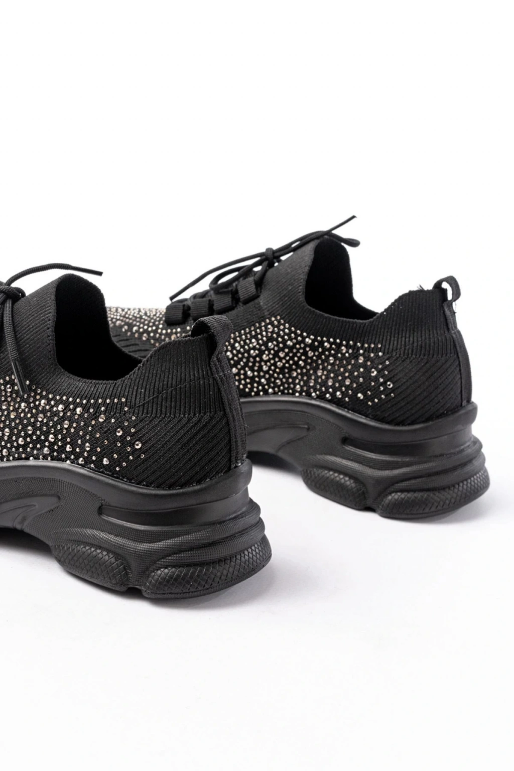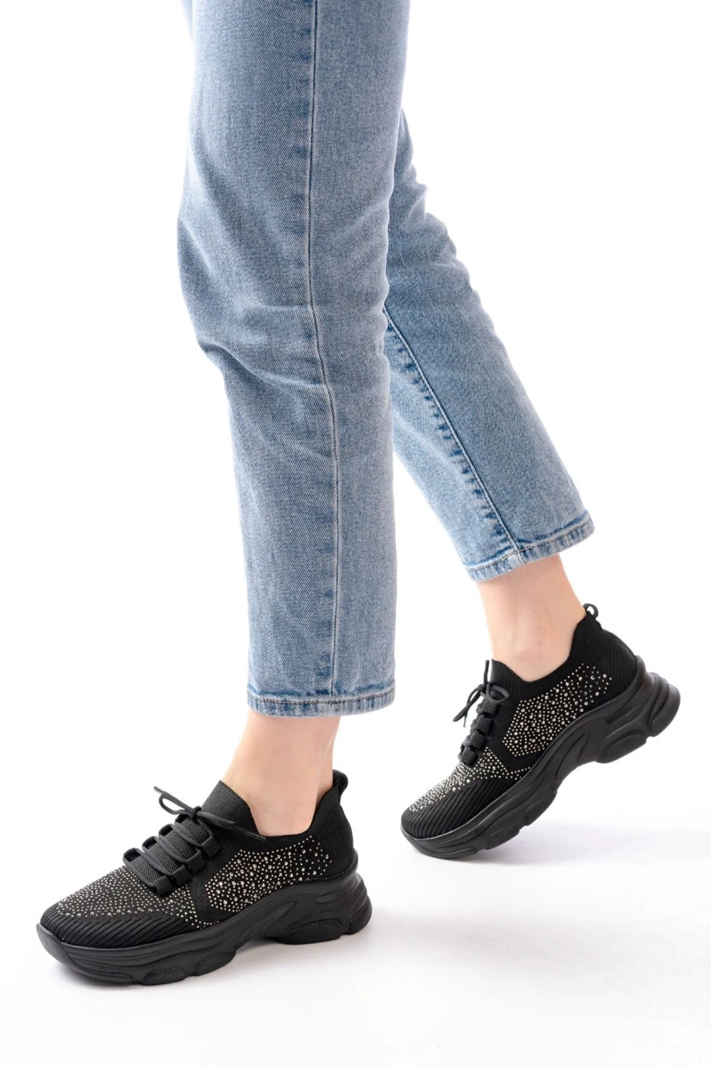 3002 Siyah Bağcıklı Fileli Taş Aksesuarlı Günlük Spor Ayakkabı