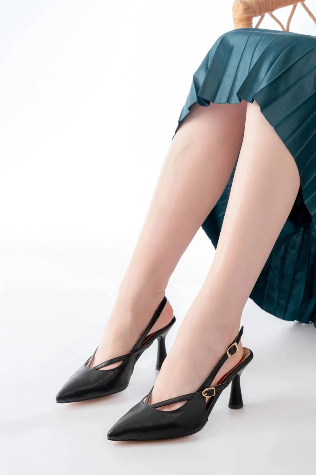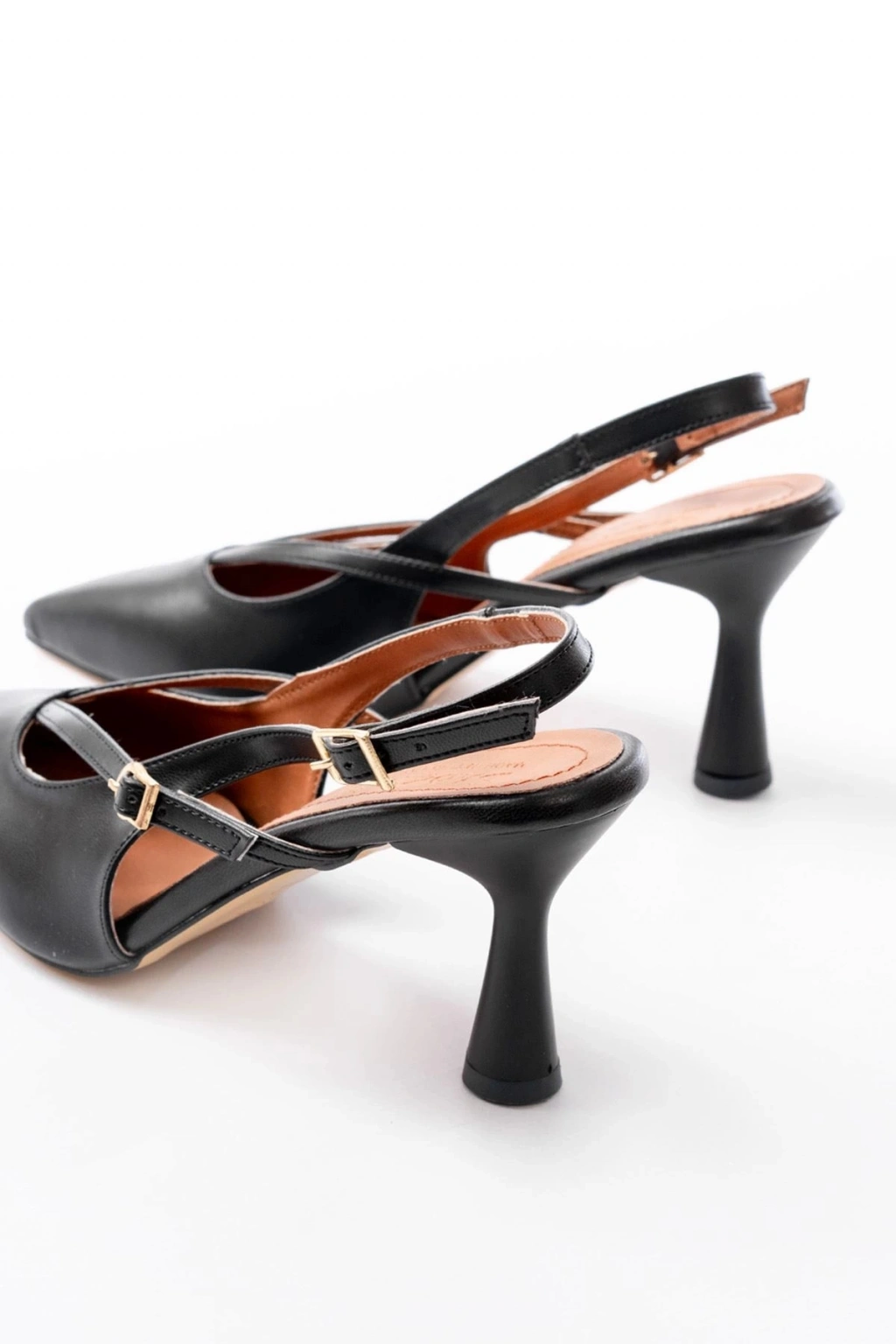 4962 Siyah Sivri Burun Tokalı Yuvarlak Topuk Kadın Sandalet