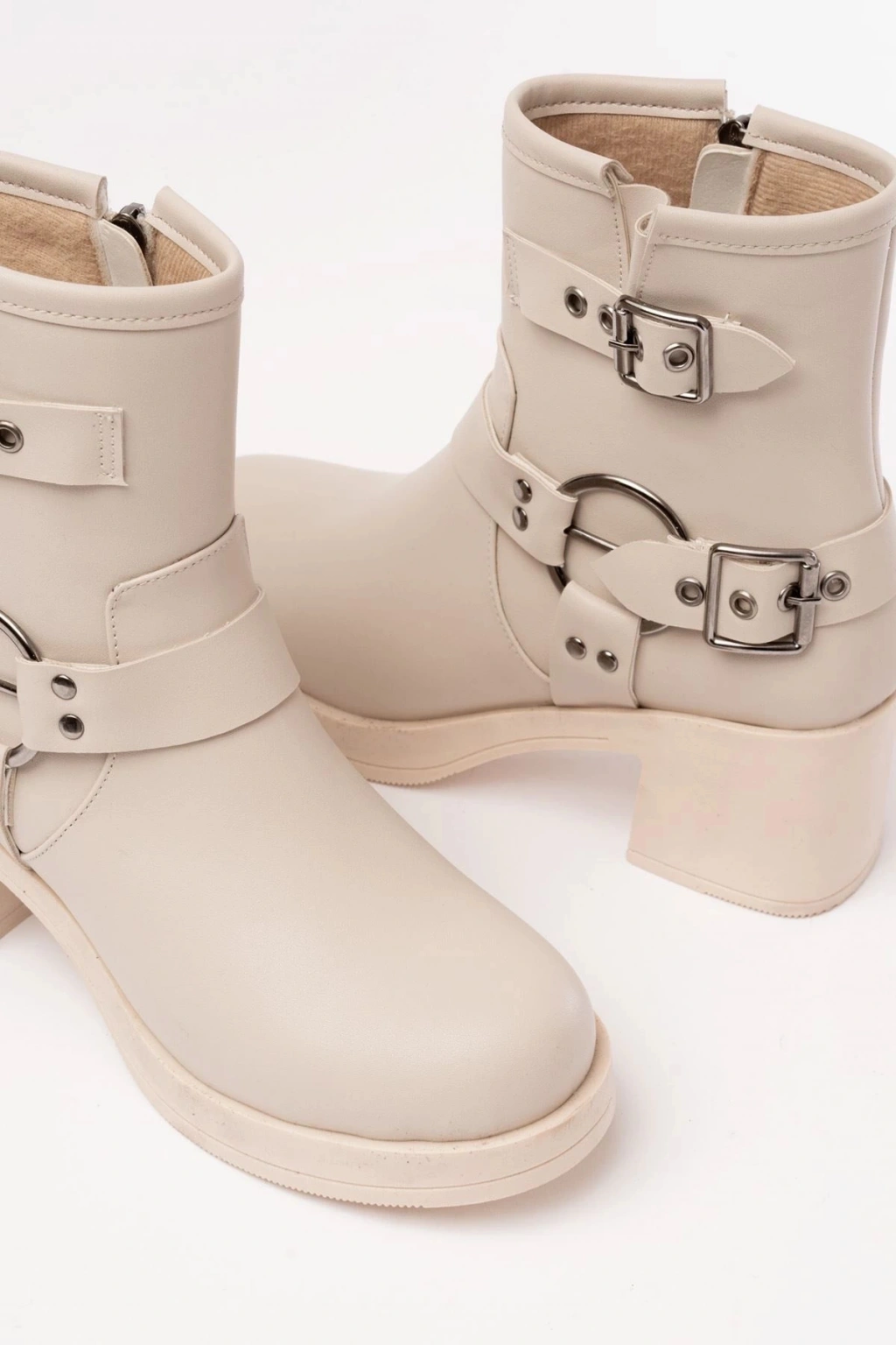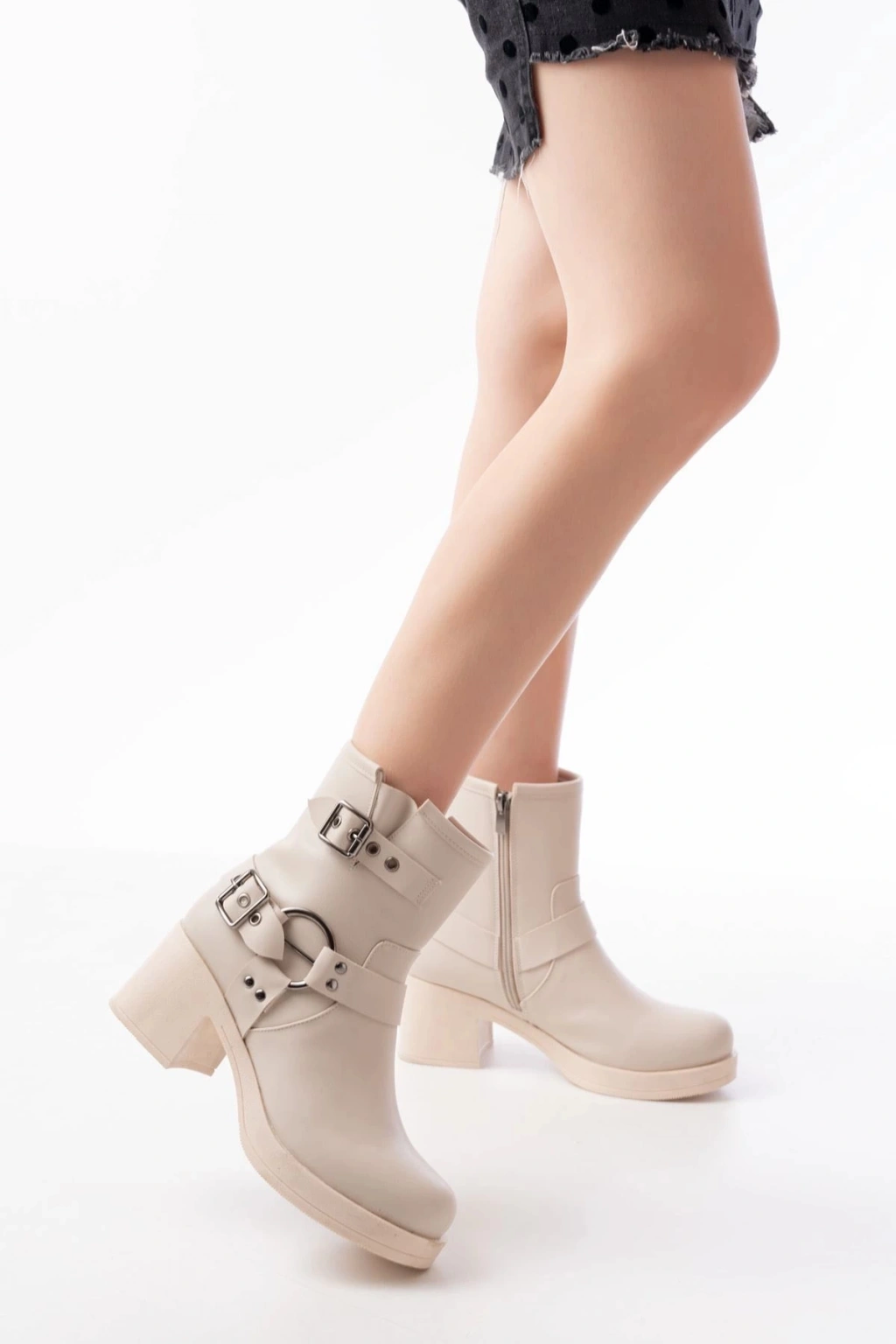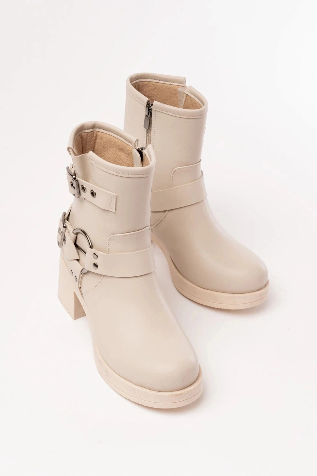 5109-3028 Bej Toka Aksesuarlı Fermuarlı Topuklu Günlük Kadın Bot