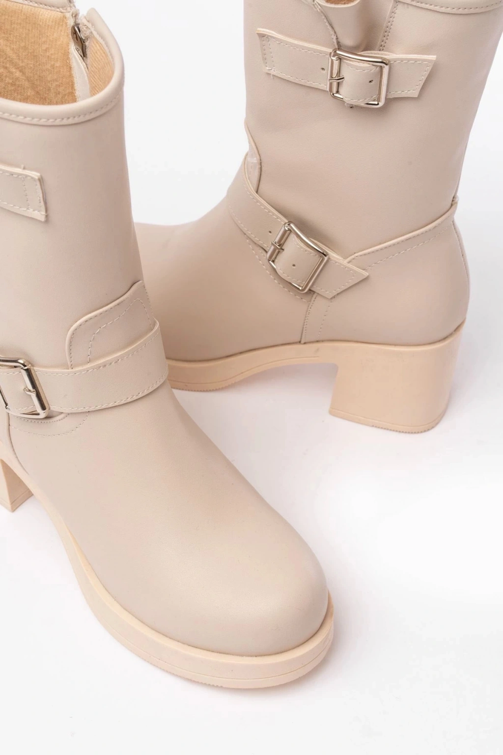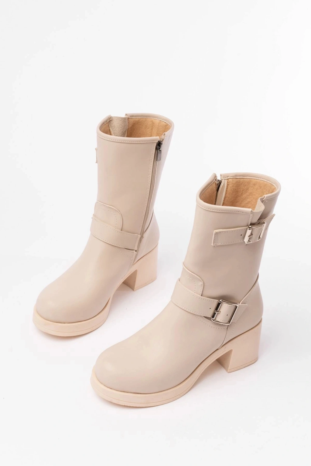 5109-3043 Bej Toka Aksesuarlı Fermuarlı Kalın Topuklu Günlük Kadın Bot