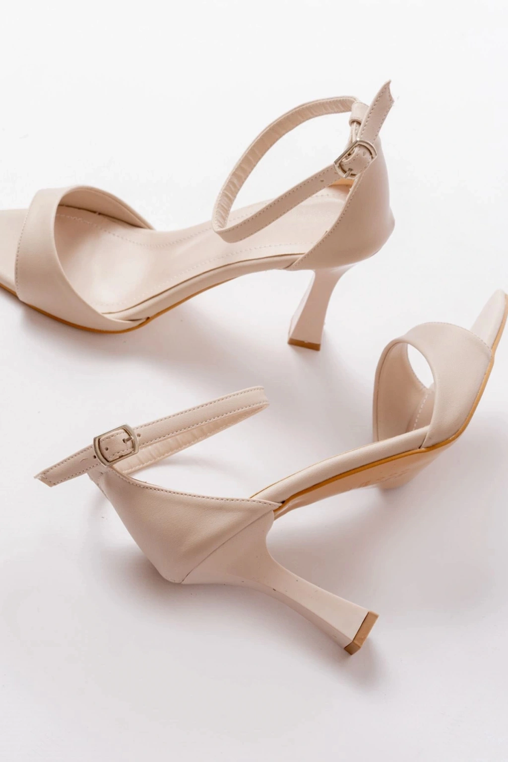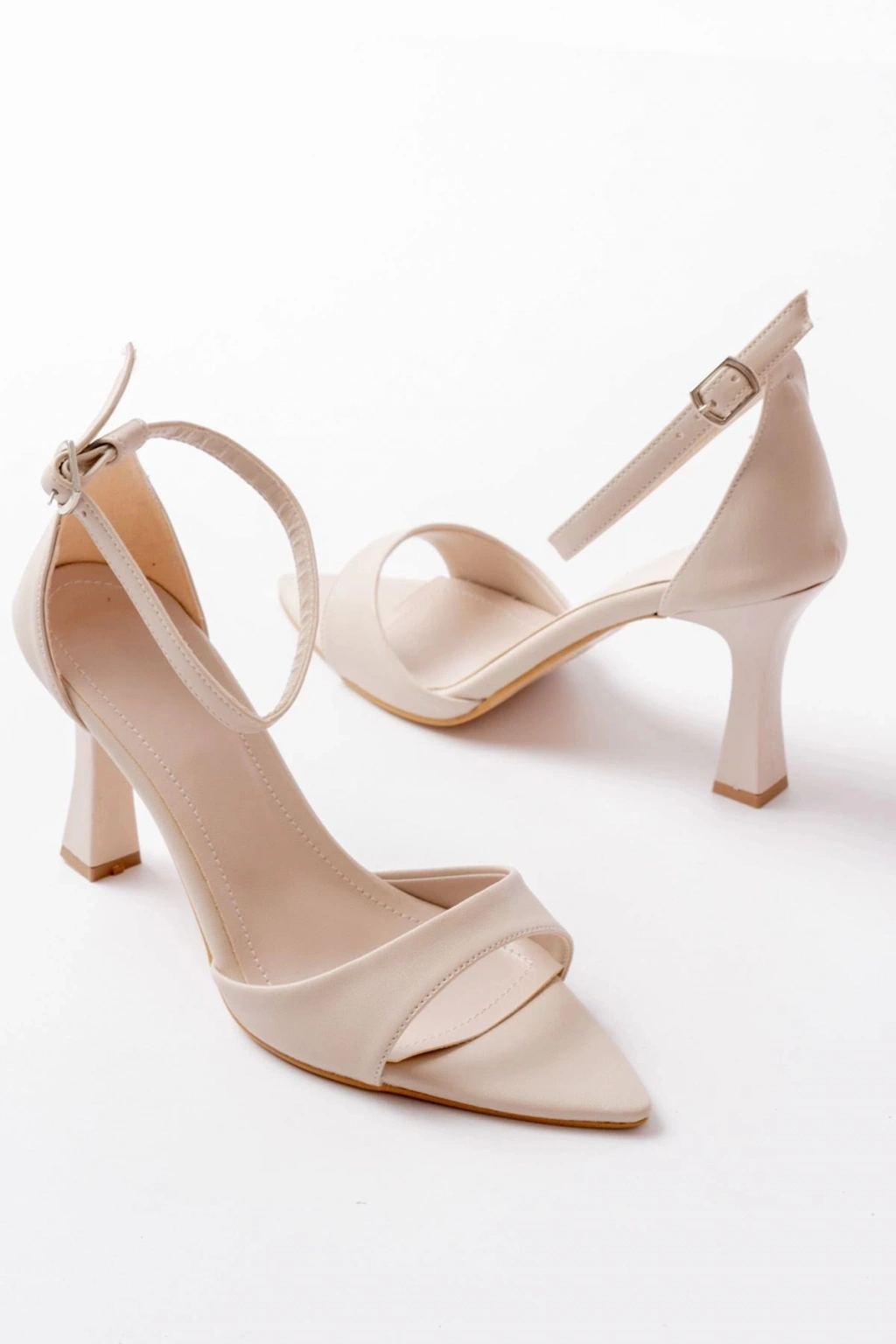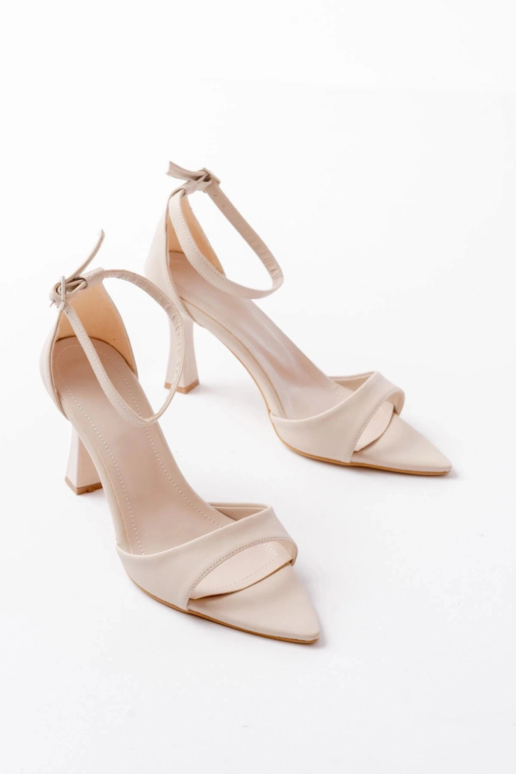 718 Bej Cilt Sivri Burunlu Topuklu Bilekten Bağlamalı Kadın Ayakkabı