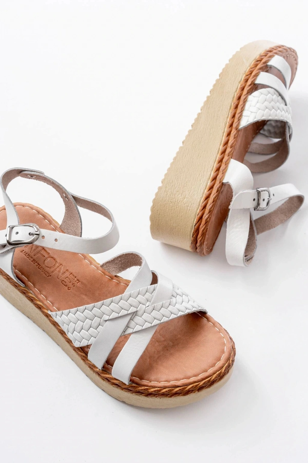730-138 Beyaz Örgü Hakiki Deri Ortopedik Taban Kadın Sandalet