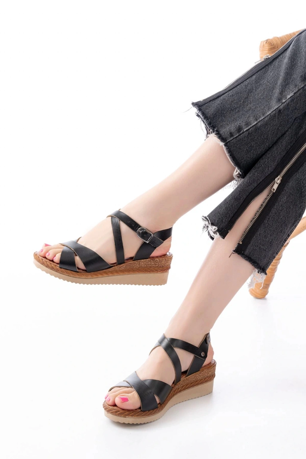 731-045 Siyah Çapraz Hakiki Deri Dolgu Topuklu Günlük Kadın Sandalet