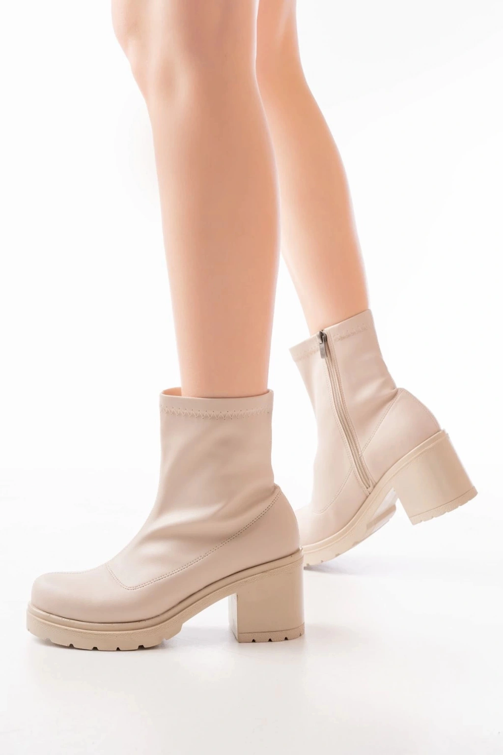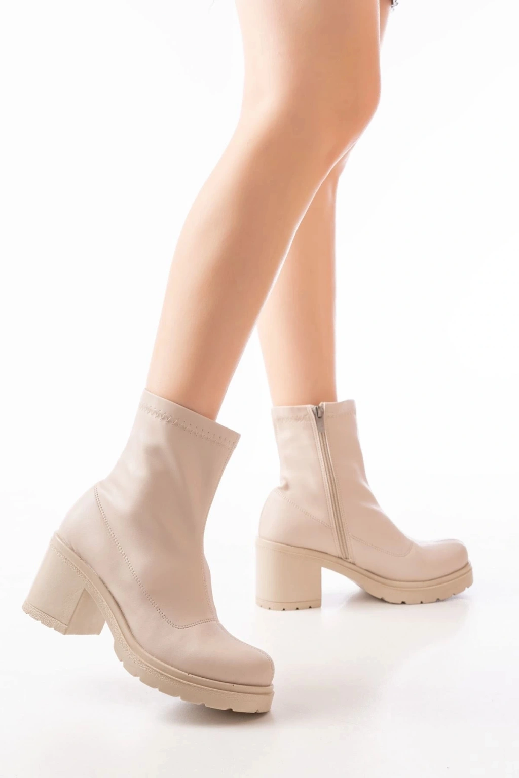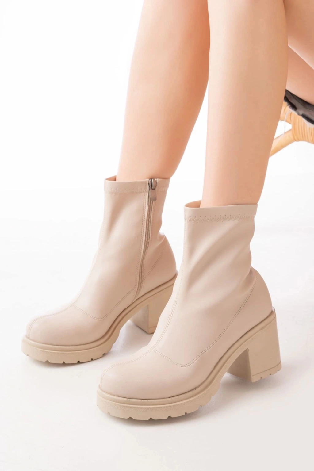 767-3012 Streç Bej Fermuarlı Kalın Topuklu Günlük Kadın Bot