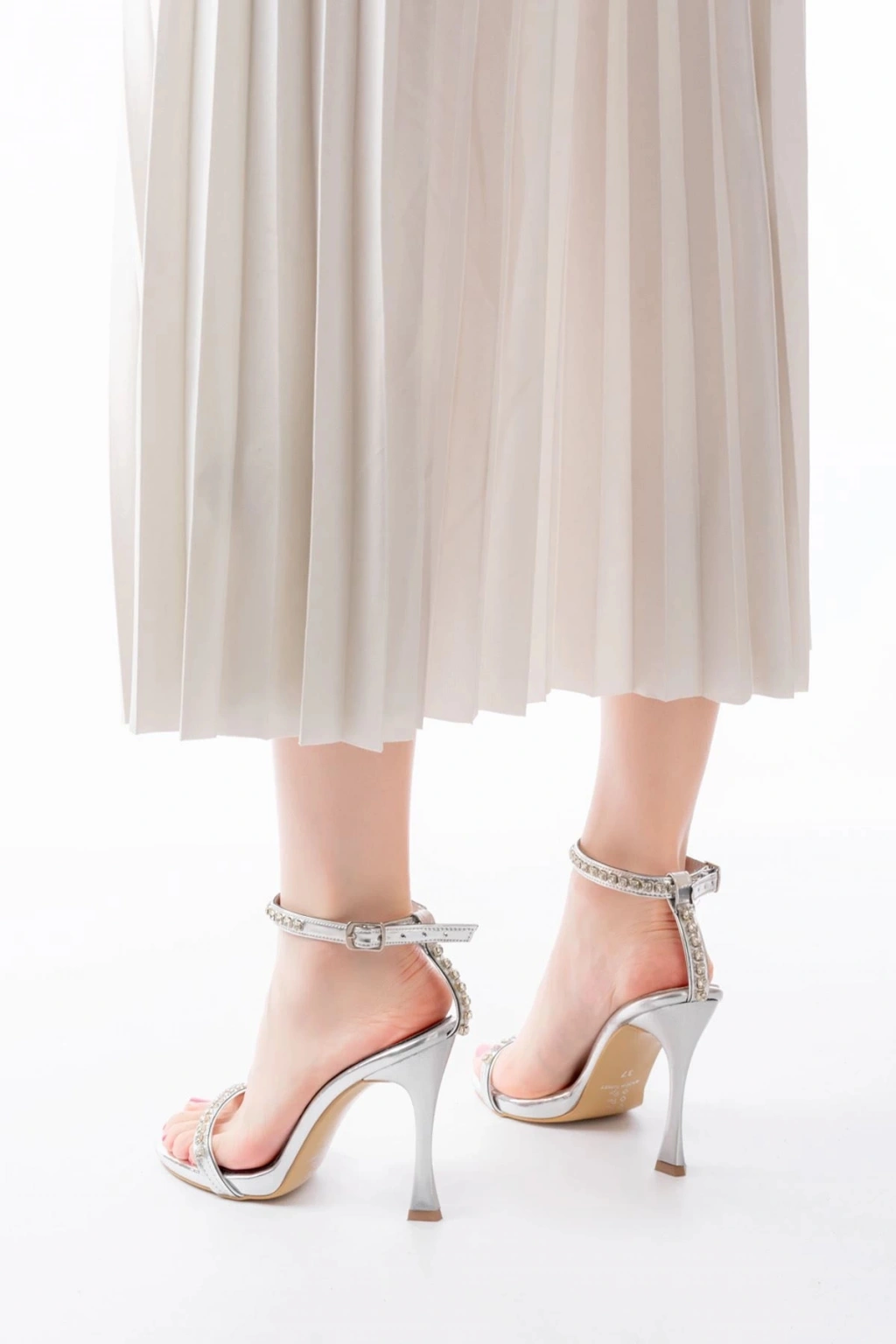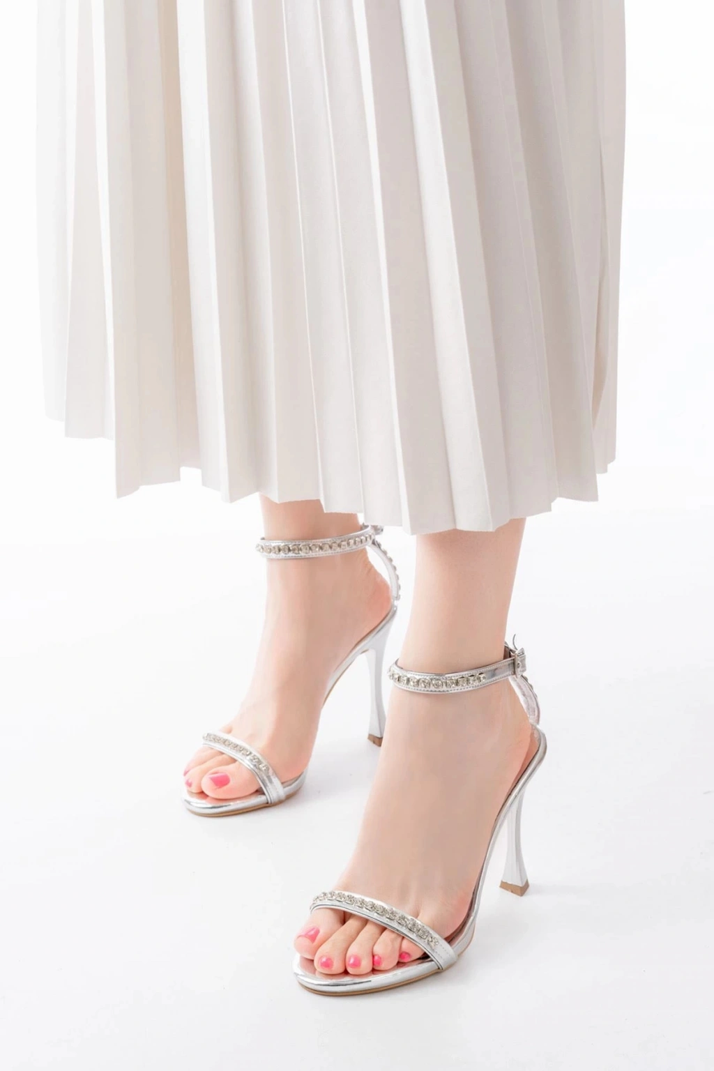 A-30 Gümüş Taş Aksesuarlı Platformlu Topuklu Kadın Terlik