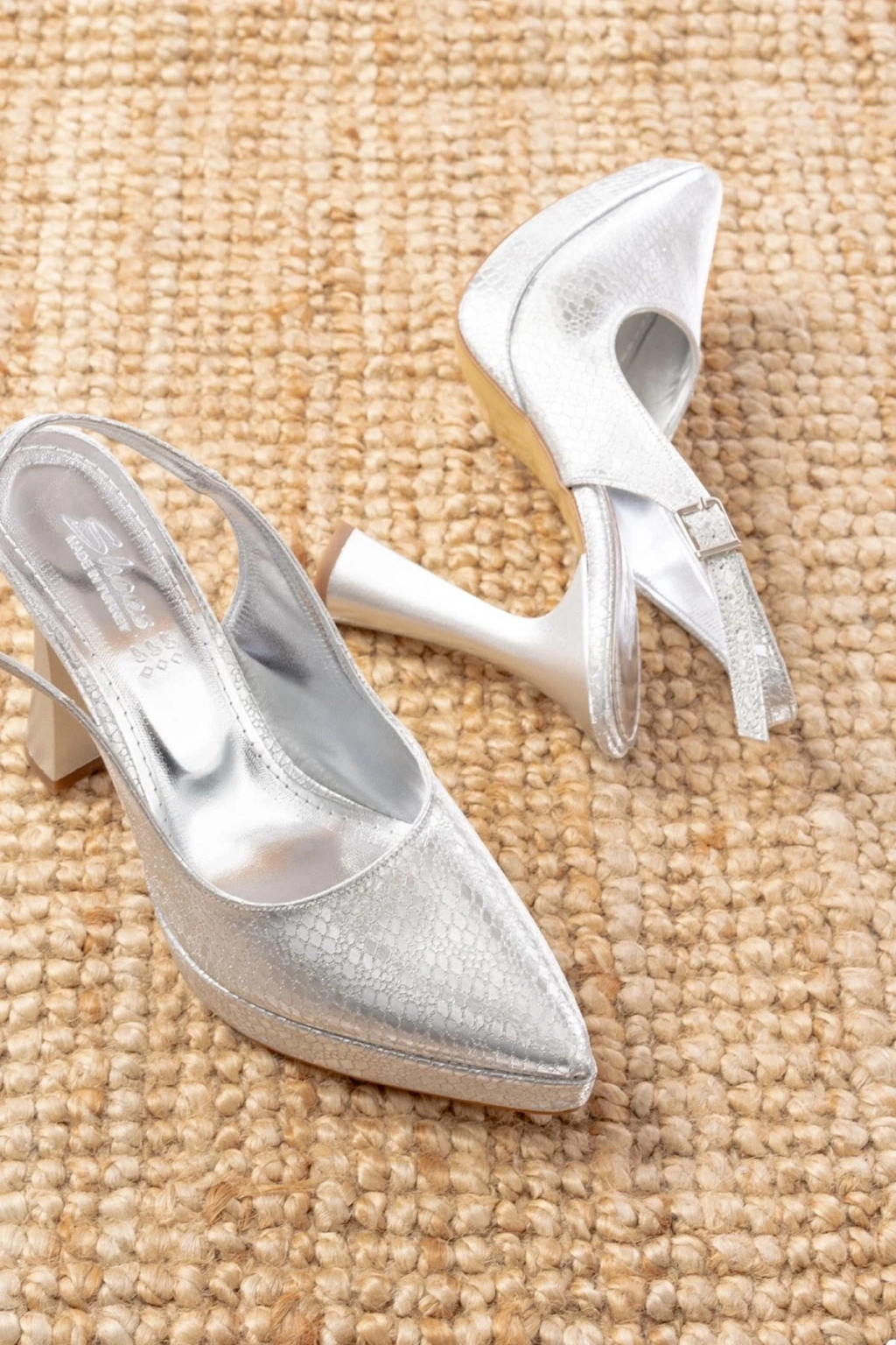B-2101 Gümüş Günlük Arkası Açık Yılan Desenli Topuklu Bayan Ayakkabı