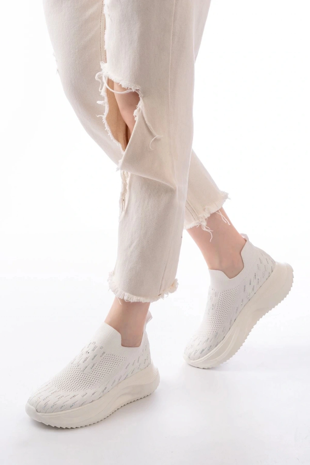 DM-707 Beyaz Fileli Faillant Taban Taş Aksesuarlı Günlük Spor Ayakkabı
