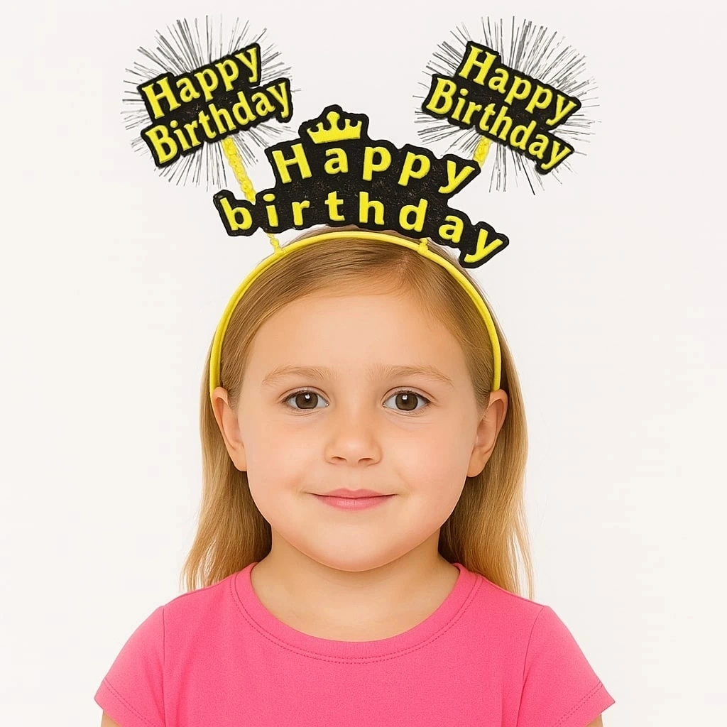 Doğum günü partilerini renklendirecek bu sarı Happy Birthday yazılı taç, çocukların kutlamalarında eğlenceli ve şık bir görünüm sunar. Parlak sarı detayları, ışıldayan yıldız patlaması figürleri ve esnek yapısı ile hem kız hem de erkek çocuklar için uygundur.