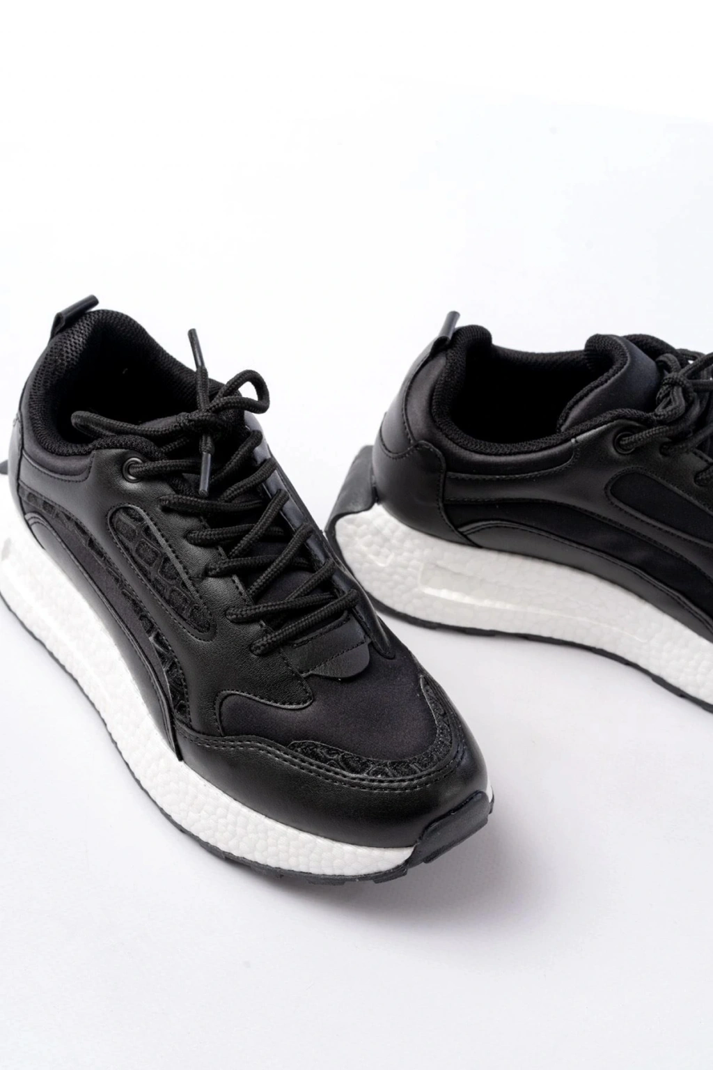F-307 Siyah Bağcıklı Saten Taş Aksesuarlı Günlük Spor Ayakkabı