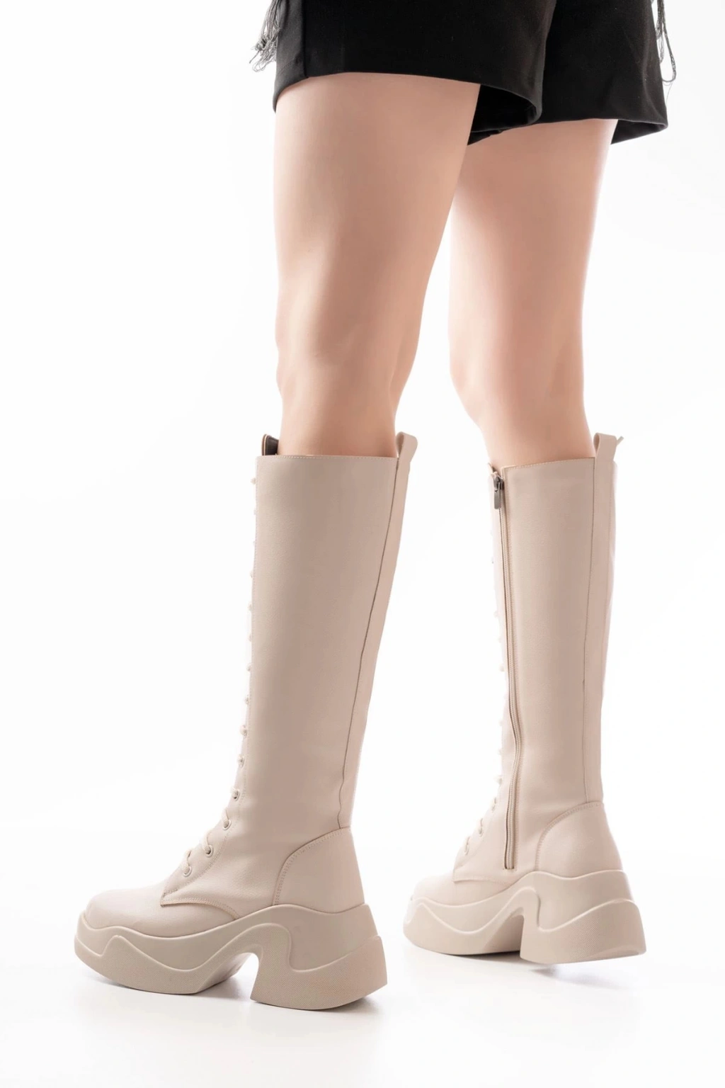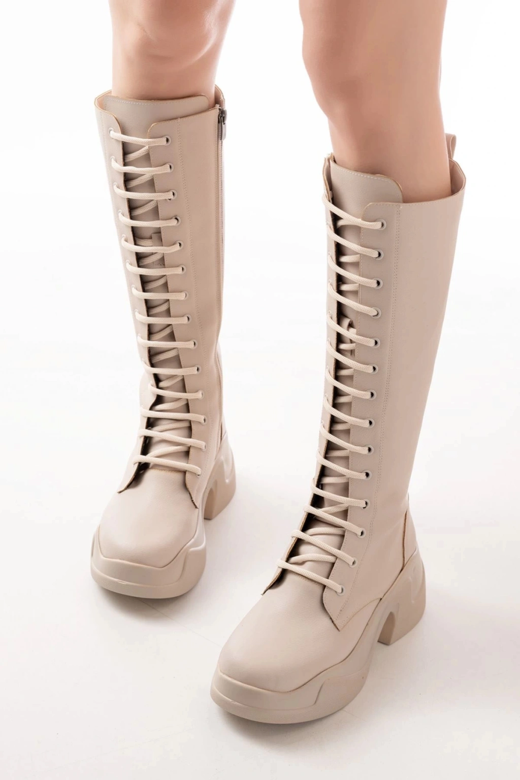 FZ-2450 Bej Yüksek Tabanlı Bağcıklı Fermuarlı Günlük Kadın Çizme