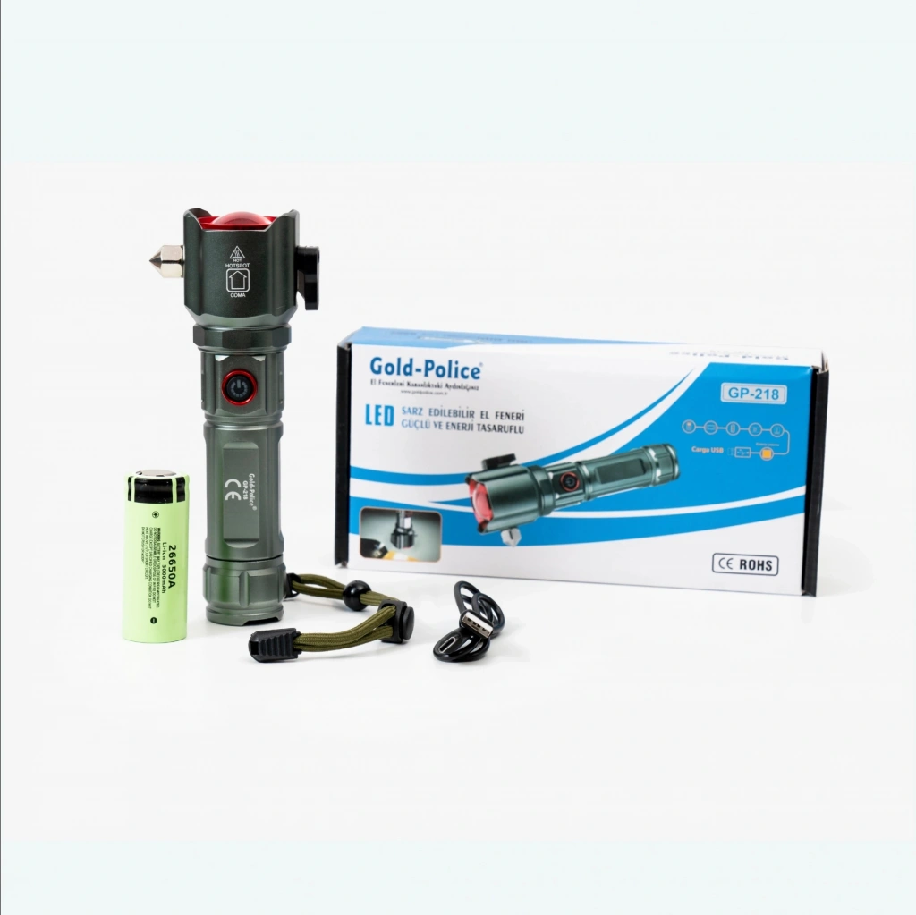 Gold Police GP-218 acil durum el feneri, güvenliğinizi ön planda tutarken güçlü ve uzun menzilli aydınlatma sağlayan kaliteli bir el feneridir. GP-218 el feneri, güvenlik ve aydınlatmanın mükemmel birleşimi olarak, iş güvenliği ortamlarında kullanım için ideal bir seçimdir. GP-218 el feneri, güçlü aydınlatma kapasitesi ve hayati güvenlik özellikleriyle, zorlu çalışma koşullarında güvenilir bir performans sunar.