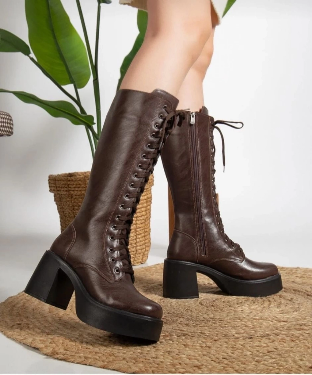 Guay Kahverengi Cilt Bağcıklı Topuklu Çizme