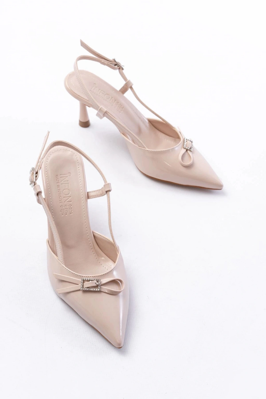 İNF-2300 Bej Rugan Günlük Arkası Açık Fiyonklu Topuklu Bayan Ayakkabı