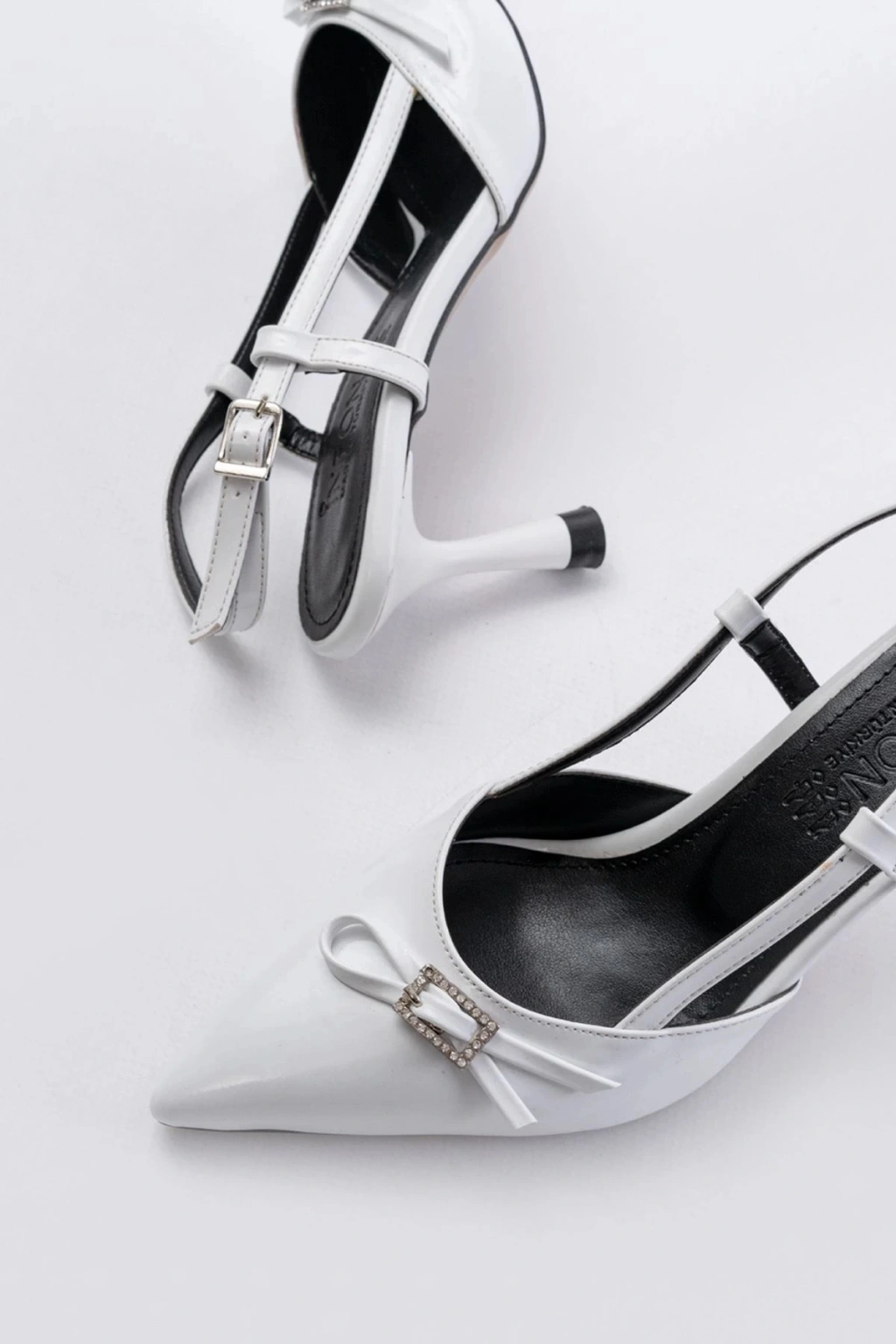 İNF-2300 Beyaz Rugan Günlük Arkası Açık Fiyonklu Topuklu Bayan Ayakkabı