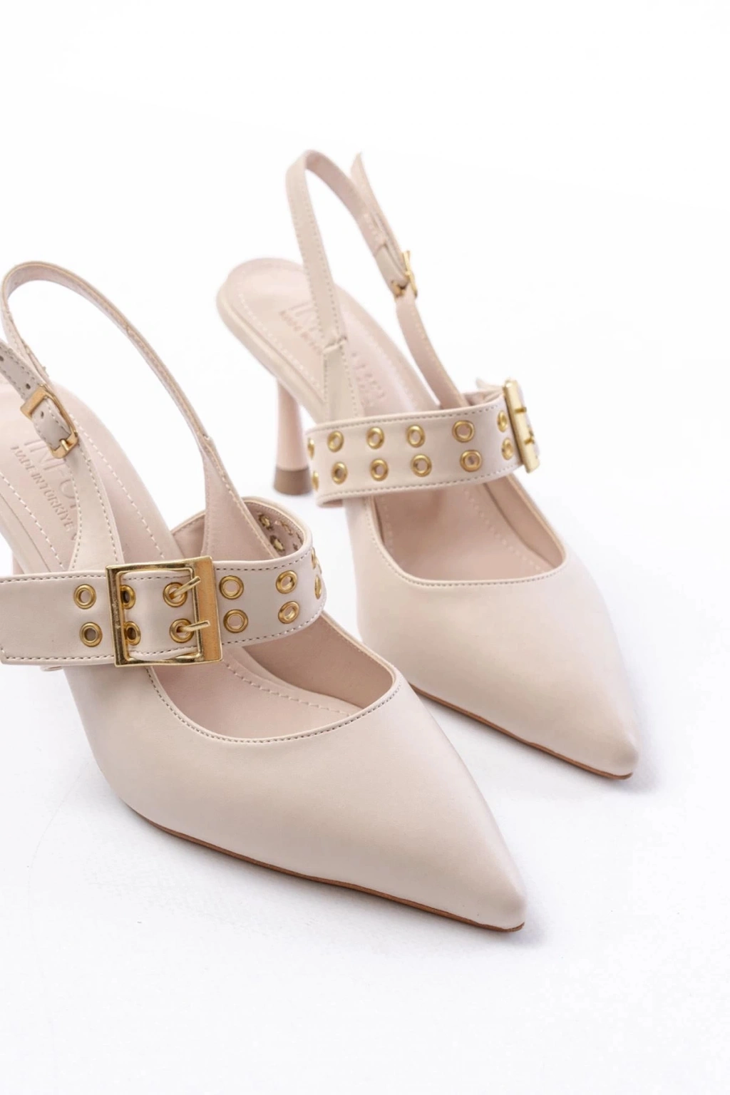 İNF-260 Bej Günlük Arkası Açık Baret Tokalı Topuklu Bayan Ayakkabı