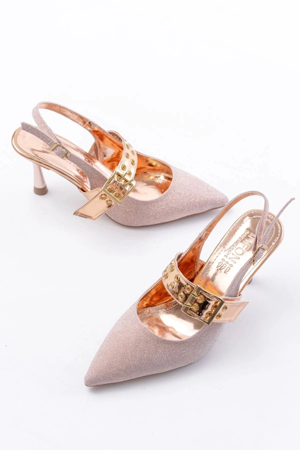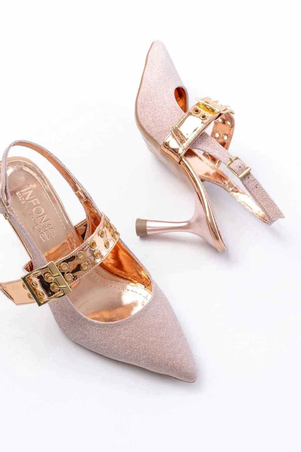 İNF-260 Rose Simli Günlük Arkası Açık Baret Tokalı Topuklu Bayan Ayakkabı