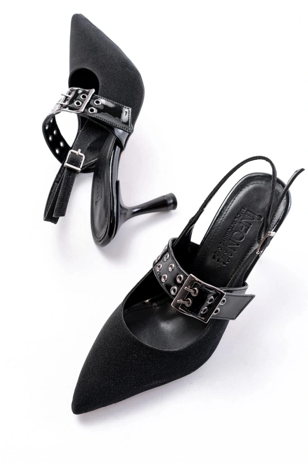 İNF-260 Siyah Simli Günlük Arkası Açık Baret Tokalı Topuklu Bayan Ayakkabı