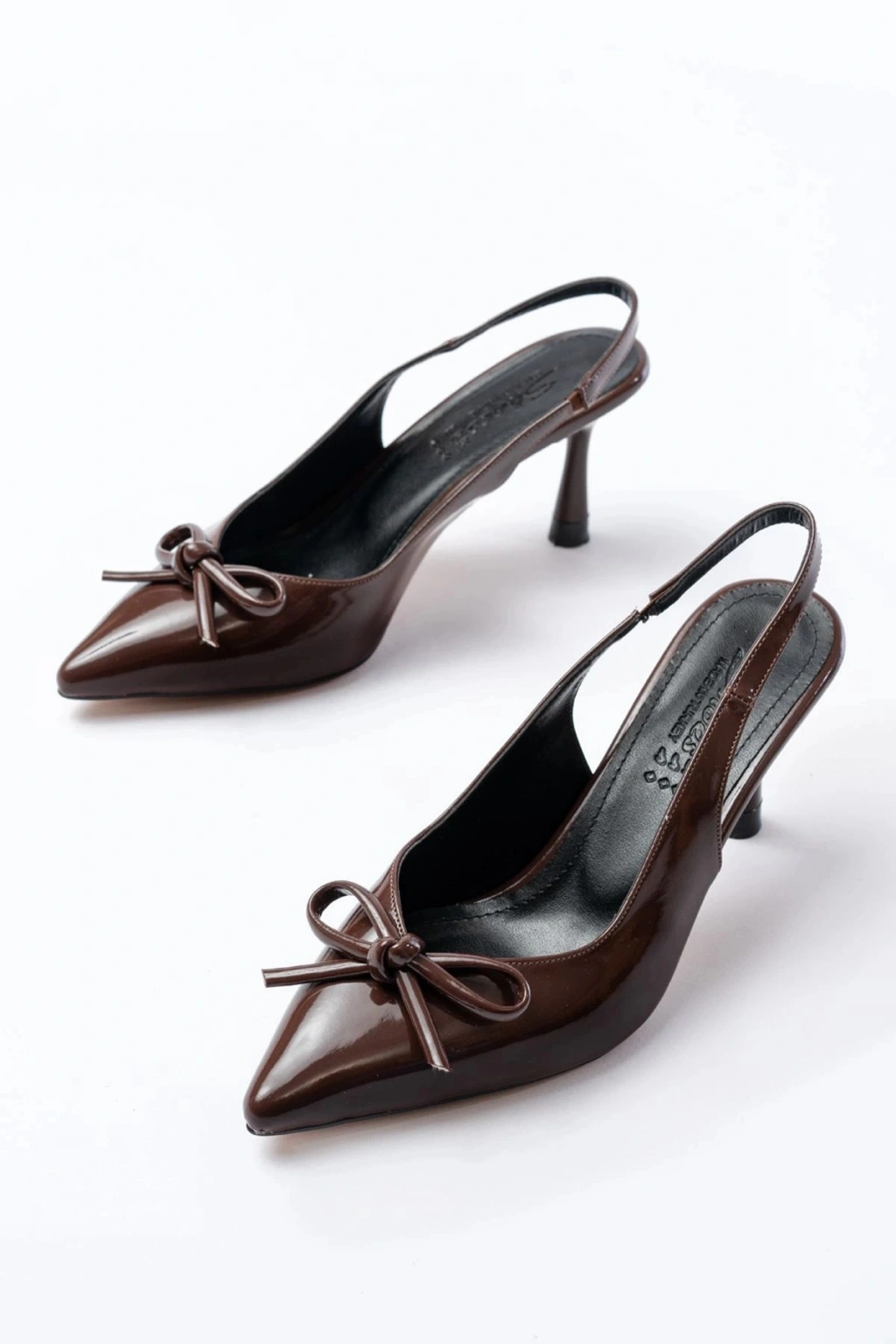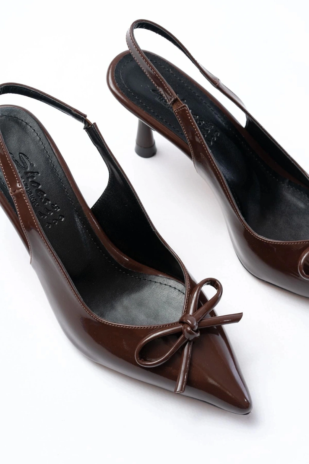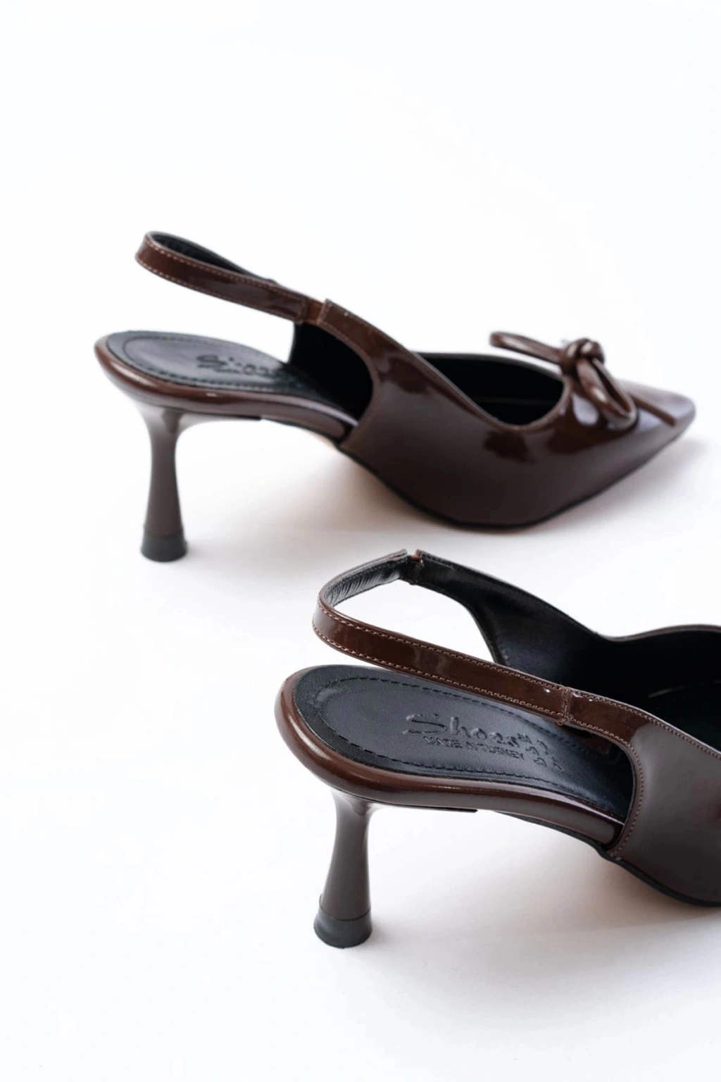 İNF-4500 Kahve Rugan Günlük Arkası Açık Fiyonklu Topuklu Bayan Ayakkabı