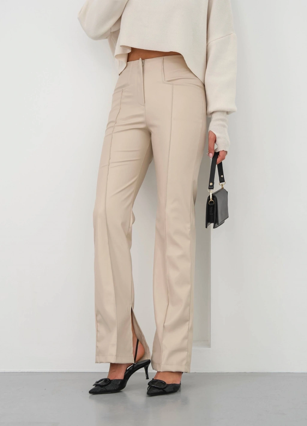 İspanyol yırtmaçlı paça deri pantolon bej hn