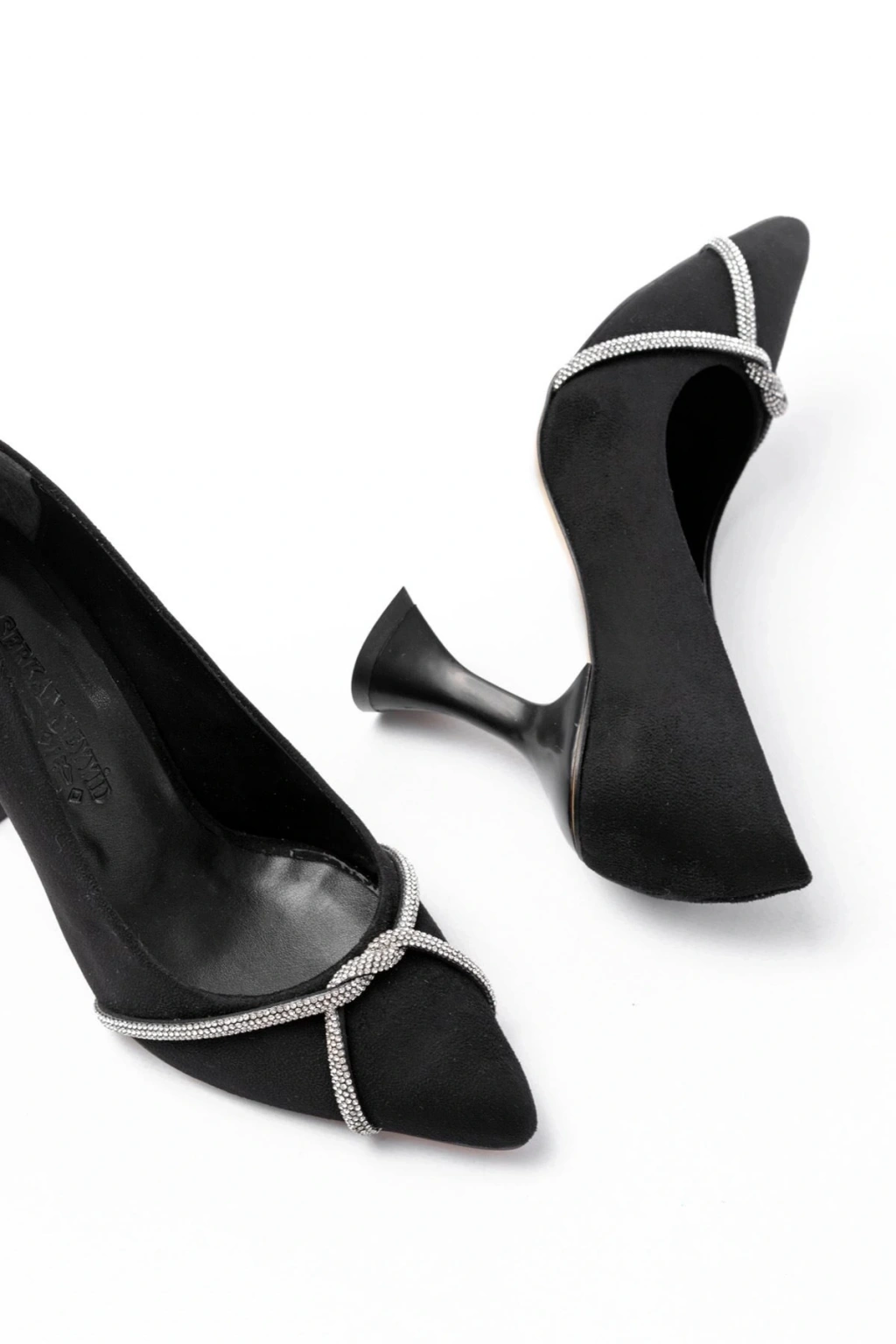 K-10 Siyah Süet Günlük Sarmal Taşlı Topuklu Kadın Ayakkabı