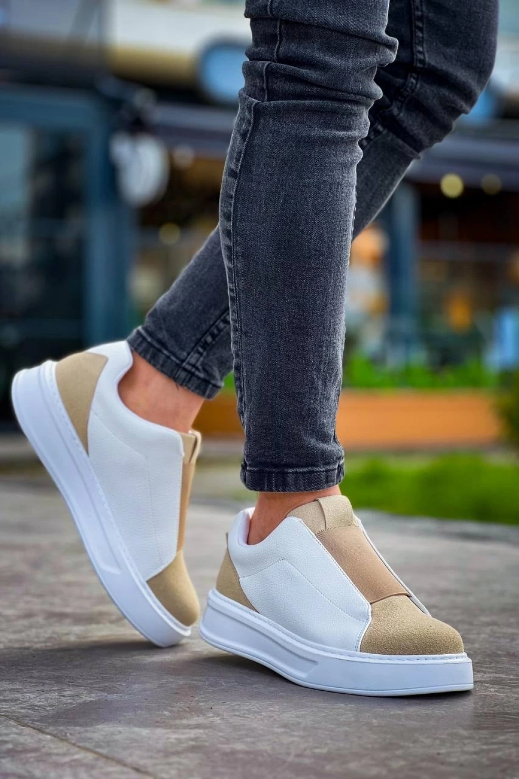 KB-007 Kuback Beyaz Bej Yüksek Taban Tek Bant Bağcıksız Günlük Erkek Ayakkabı