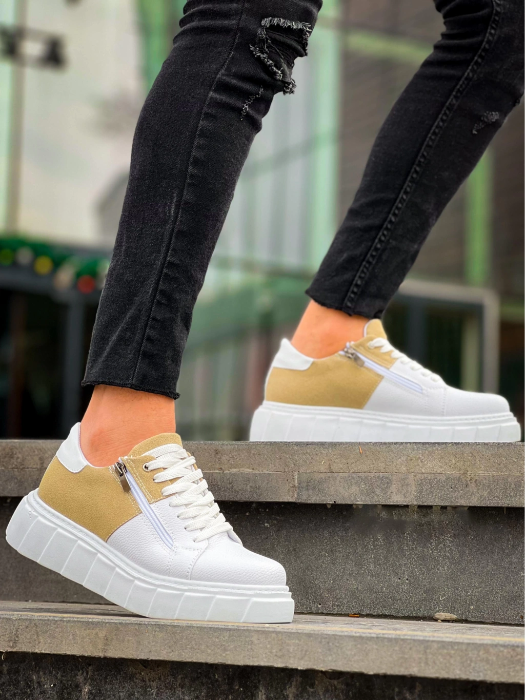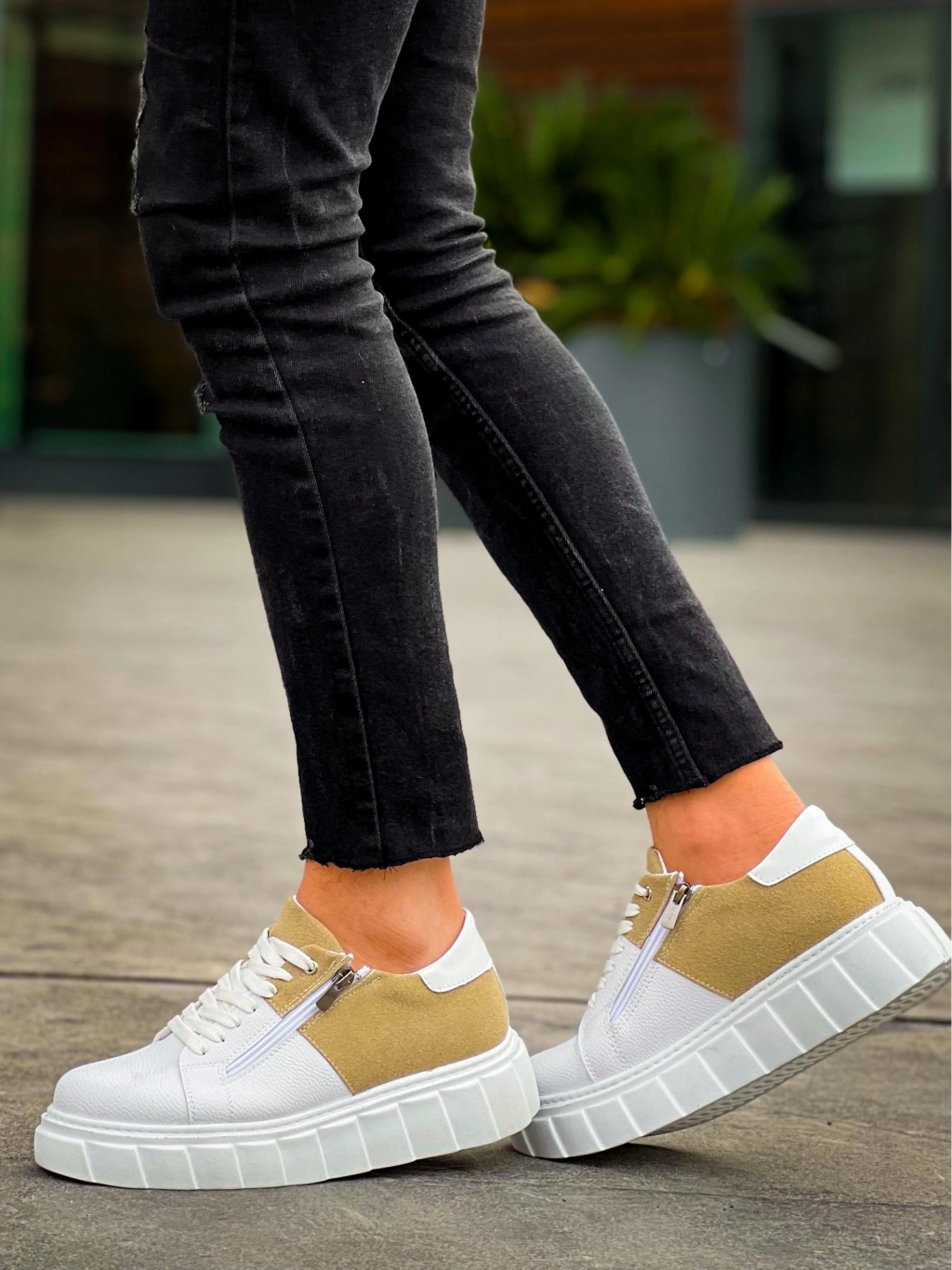 KB-X155 Kuback Beyaz Cilt Bej Süet Detaylı Beyaz Yüksek Taban Günlük Spor Ayakkabı