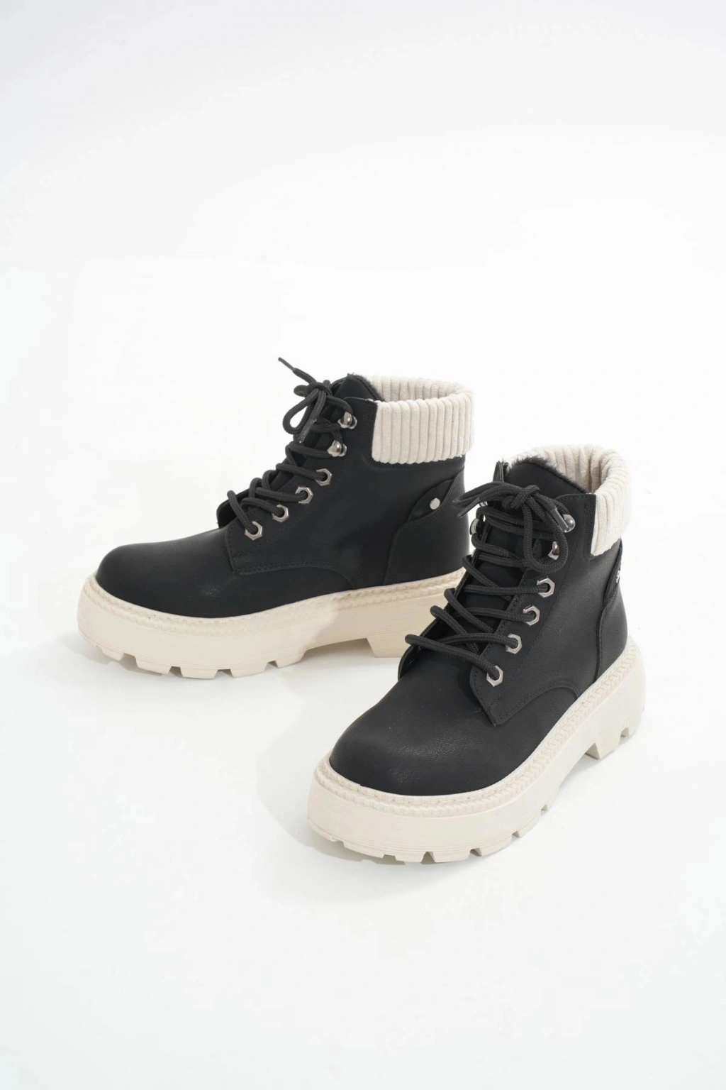 LMÇ-2045 Siyah-Bej Taban Bağcıklı Kalın Taban Kadın Günlük Bot