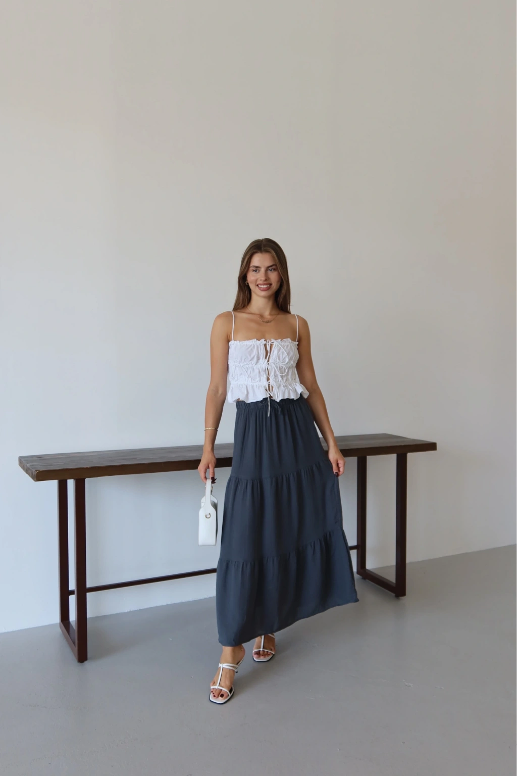 Yüksek kaliteli müslin ve keten karışımı ile üretilmiş uzun etek, gardırobunuzun vazgeçilmezi olmaya aday. Antrasit rengiyle şıklığı ve zarafeti bir arada sunan bu etek, her tarza kolaylıkla uyum sağlar. Rahat kesimi sayesinde gün boyu konfor sunarken, şık detaylarıyla da göz kamaştırır.