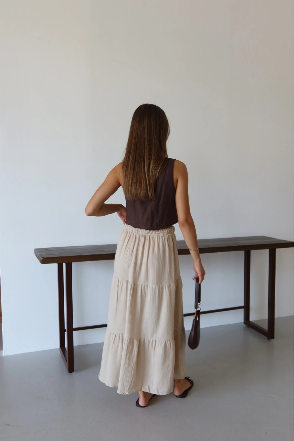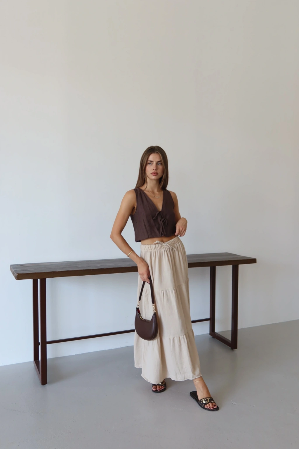 Yumuşak dokulu müslin kumaş ile tasarlanmış olan bu şık uzun etek, gardırobunuzun favori parçalarından biri olmaya aday. Hem şıklığı hem de rahatlığı bir arada sunan bej rengi, her tarza kolaylıkla uyum sağlar. Keten kumaşın sağladığı hafiflik ve doğal görünüm, yaz aylarında tercih edebileceğiniz ideal bir parça haline getiriyor.