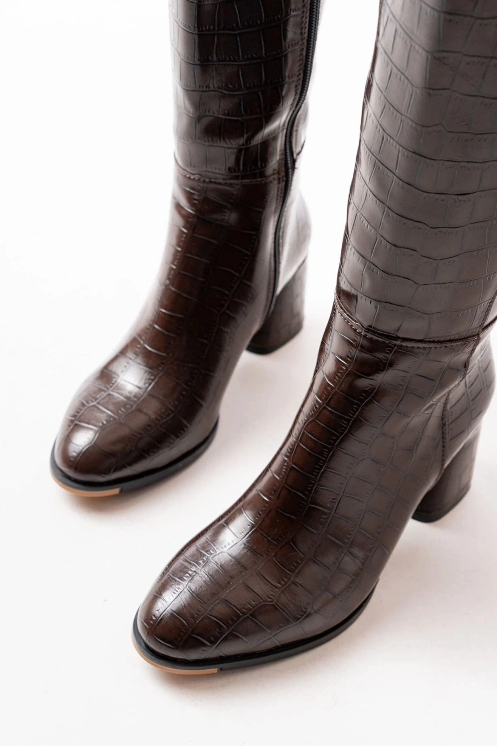 RS-2432 Kahverengi Kroko Topuklu Fermuarlı Günlük Kadın Çizme