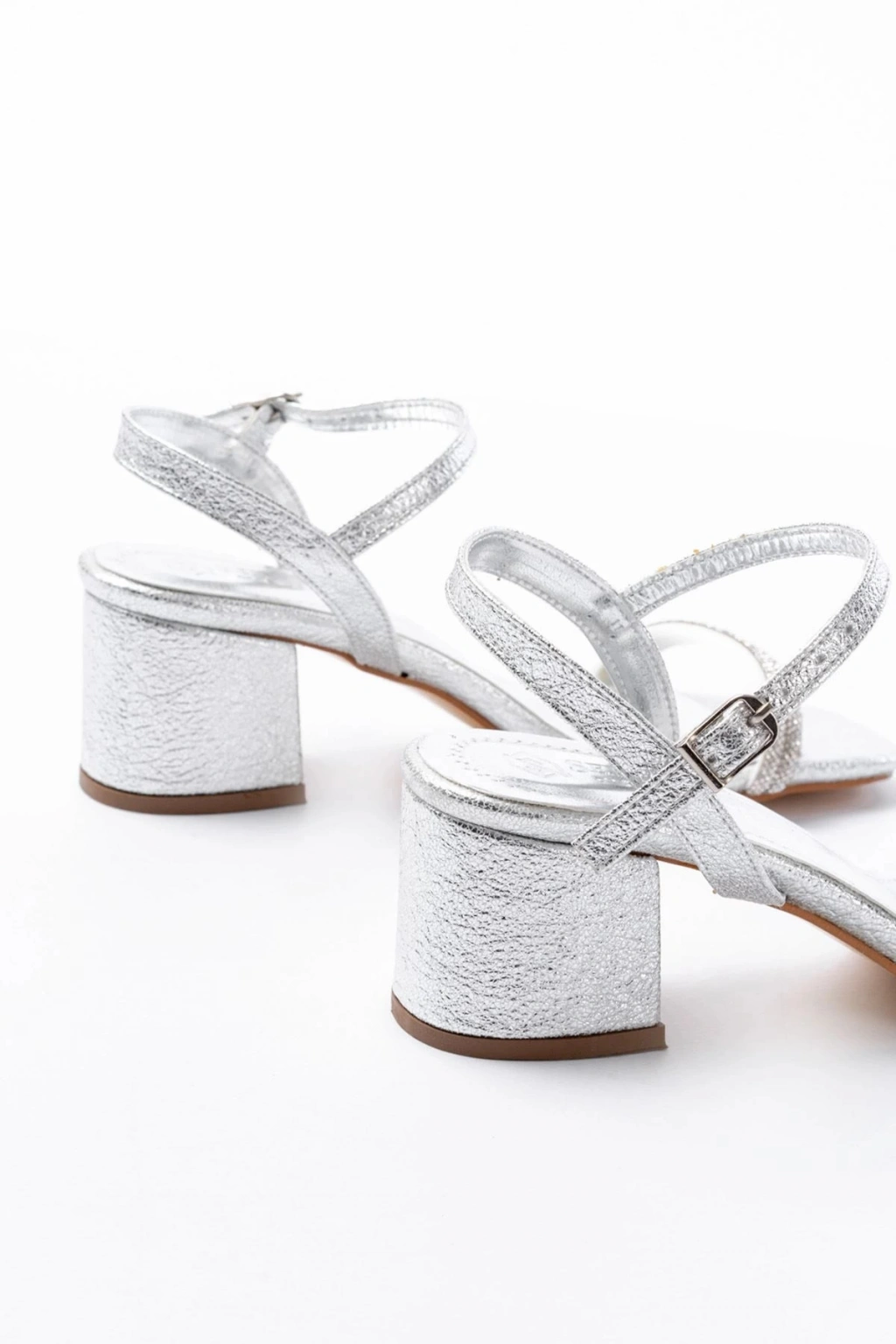 S-890 Gümüş Çift Bantlı Taşlı Kalın Topuklu Kadın Ayakkabı