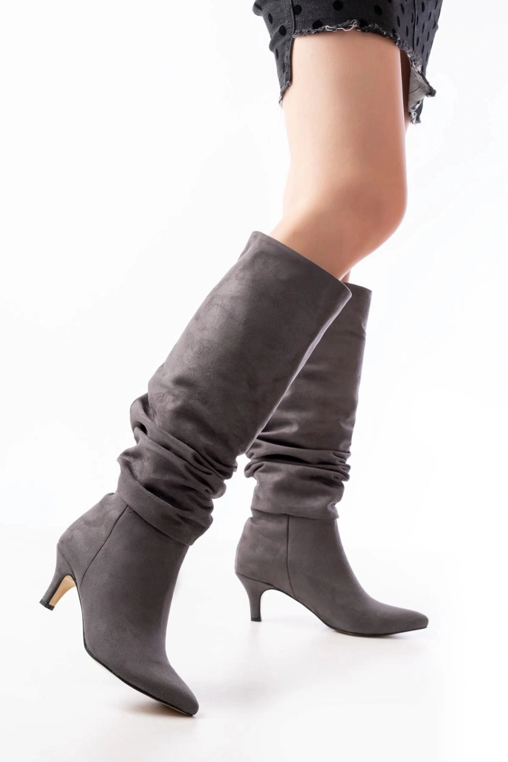SR-2001 Gri Süet İnce Topuklu Günlük Bayan Çizme