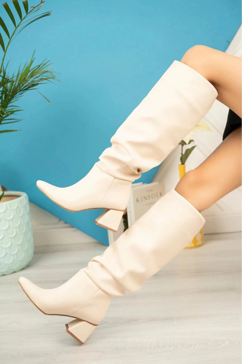 SYT-2002 Bej Körüklü Kalın Topuklu Günlük Bayan Çizme
